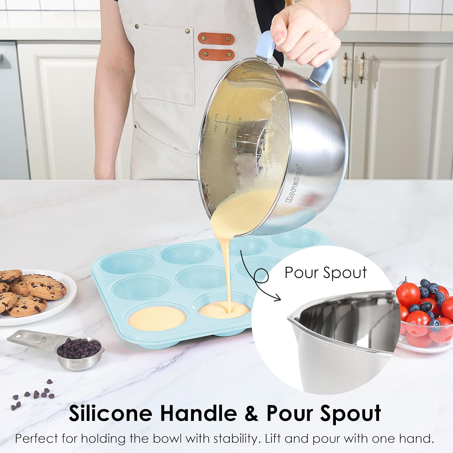 Rorence Stainless Steel Mixing Bowls Set: Non-Slip Silicone Bottom Kitchen Bowls with Pour Spout, Handle and Lid - Set of 3 - Light Blue