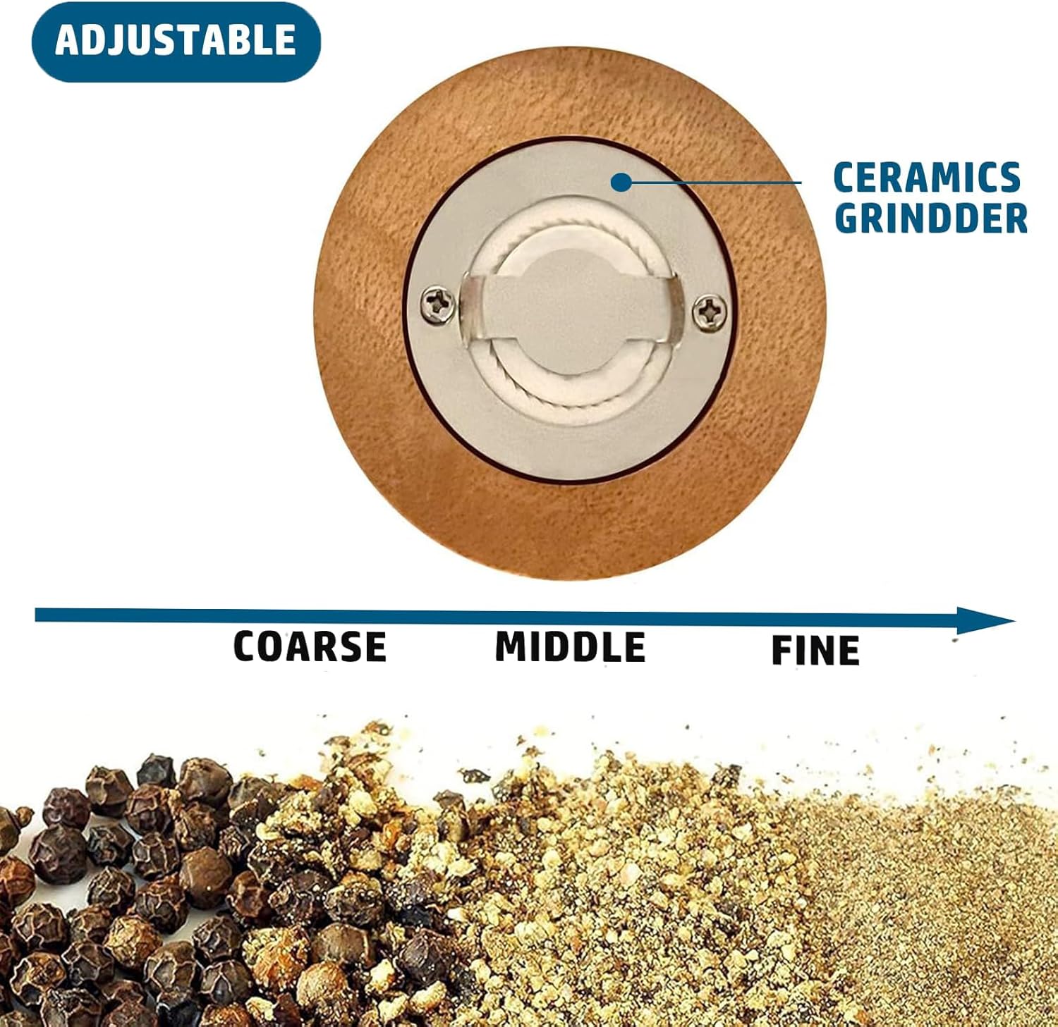 - Coarse & Fine Adjustable: Adjust the size of the ground pepper particles by rotating the top nut of the grinder loosely or tightly. Clockwise rotation produces a coarser grind and counterclockwise rotation produces a finer powder for different cooking needs