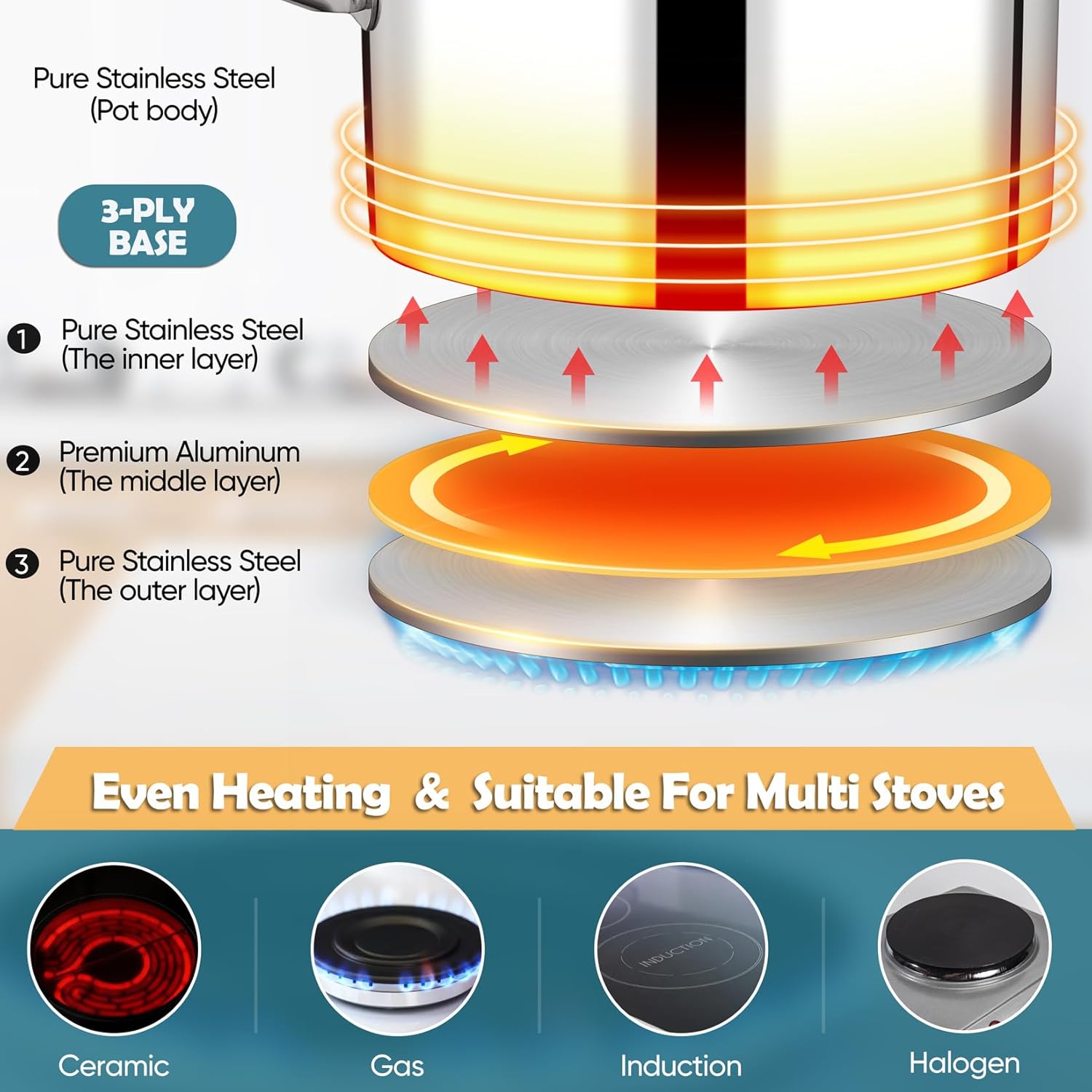 - 【Tri-ply Base for Multi Stoves】The pot bottom with 3-Ply constructions, Pure stainless steel of outer and inner layers for rust-proof and longtime use, Core aluminium is to conduct heat faster and more even (this layer will not contact your food ), And straight side helps to increase the bottom area which is equal to heating surface, To reduce your cooking time and save energy, Making your pan work with many stovetops effectively, such as induction, gas, electric and ceramic stove etc, Say goodbye to the limitations of traditional pot