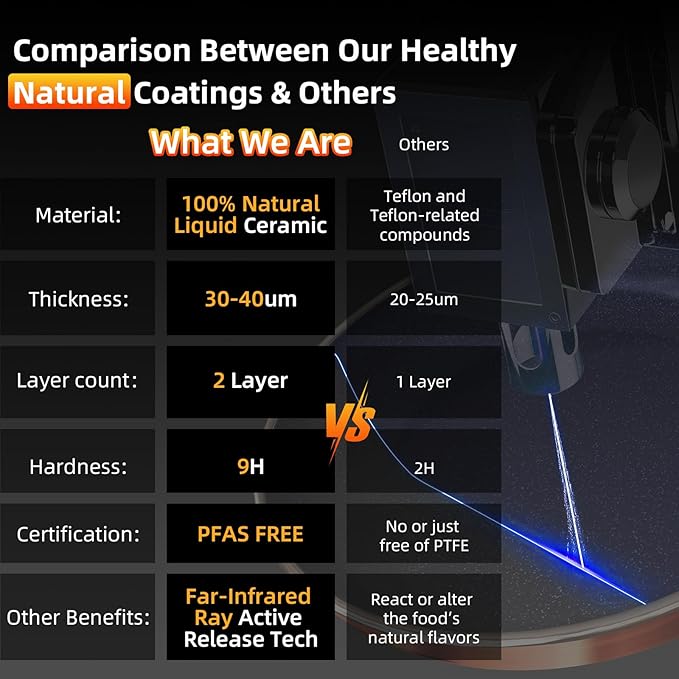 - 9H Diamond-Level Enhanced Coating: The coating achieves 9H hardness, ensuring exceptional resistance to wear, corrosion, and acids. Please note that our ceramic coating serves as an alternative to Tef*l*on. While it’s equipped with ultra non stick feature, it's not *chemically* nonstick.