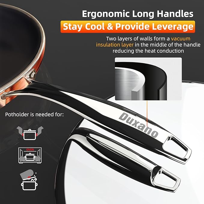 - Rapid & Even Heat Distribution: The high-pressure stamped, thick-gauge pure aluminum base ensures rapid and even heat conductivity from end to end. Say goodbye to uneven cooking caused by dead zones or hot spots. Enjoy precise and consistent heat distribution, allowing you to achieve professional-level results with every dish. From searing to simmering, the DUXANO cookware set delivers consistent heat balance for flawlessly cooked meals.