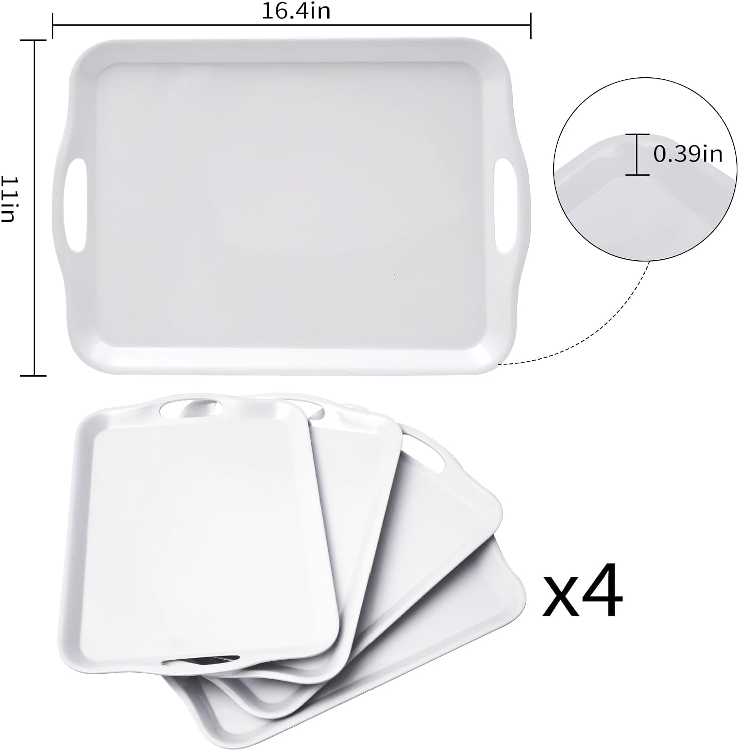 Blue Boat 16.5" x 11.5" Serving Trays Set of 4 White, Dinner Tray, Light Weight Easy to Clean Sturdy Stackable Melamine Serving Tray with Handle, Fruit, Snacks, and Desserts Trays