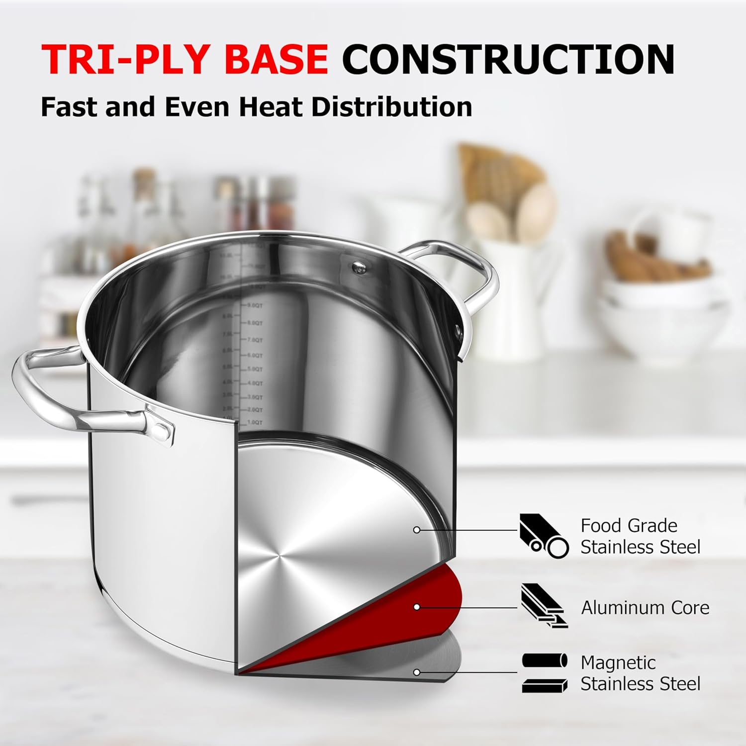 LIANYU 10 Quart Pot with Lid, 10 QT Tri-ply Stainless Steel Stockpot, Heavy Duty Deep Canning Soup Cooking Pot for Gas, Electric, Stoves, Induction, Riveted Handles, Dishwasher Safe