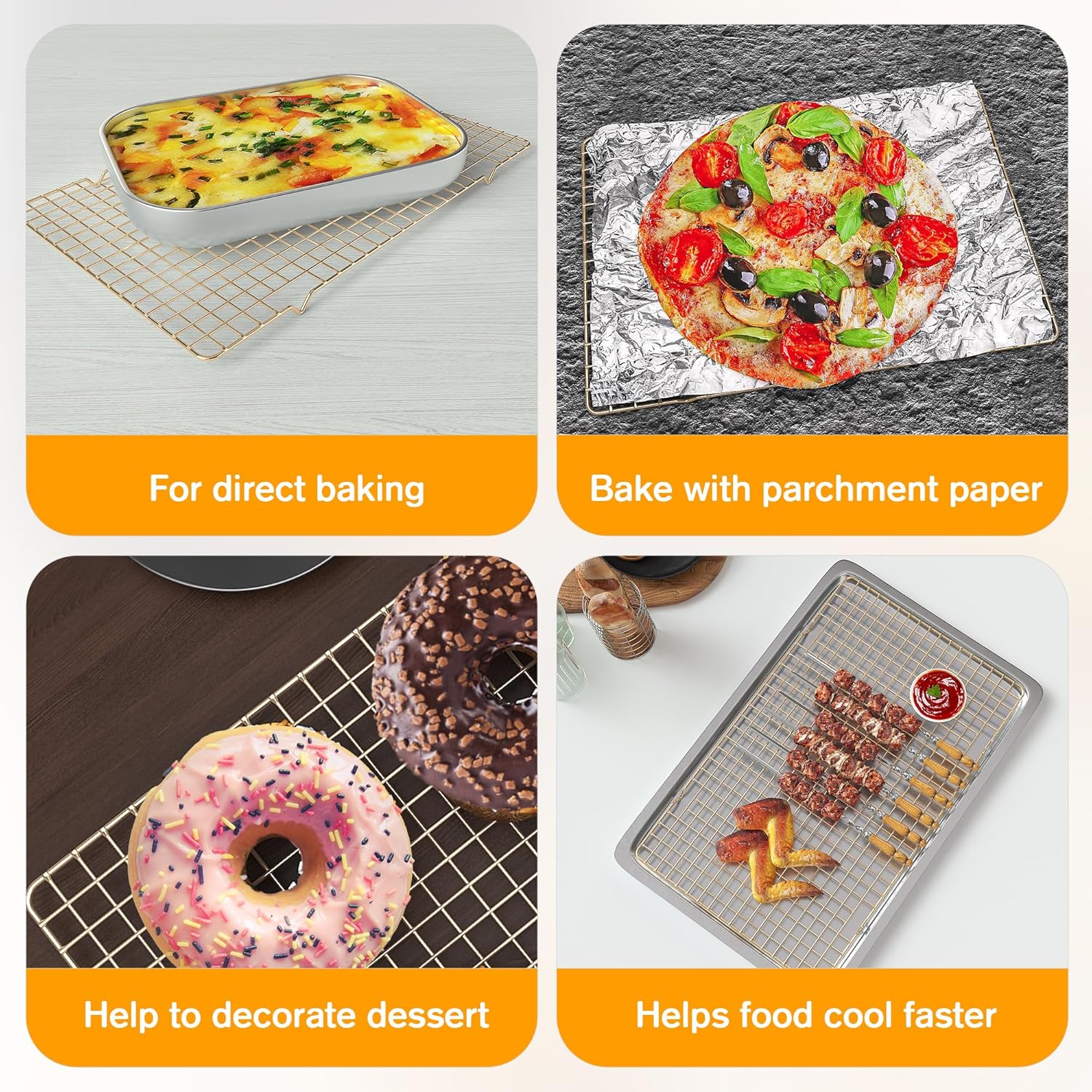 - 【FITTING SIZE & MULTIPLE USES】: Measuring 10" x 16" , fits half sheet pan and jelly roll sheet. The larger size is suitable for more cooling capacity. Can be used for grilling, baking, dessert decoration or cooling, making hosting family meals or parties more convenient.
