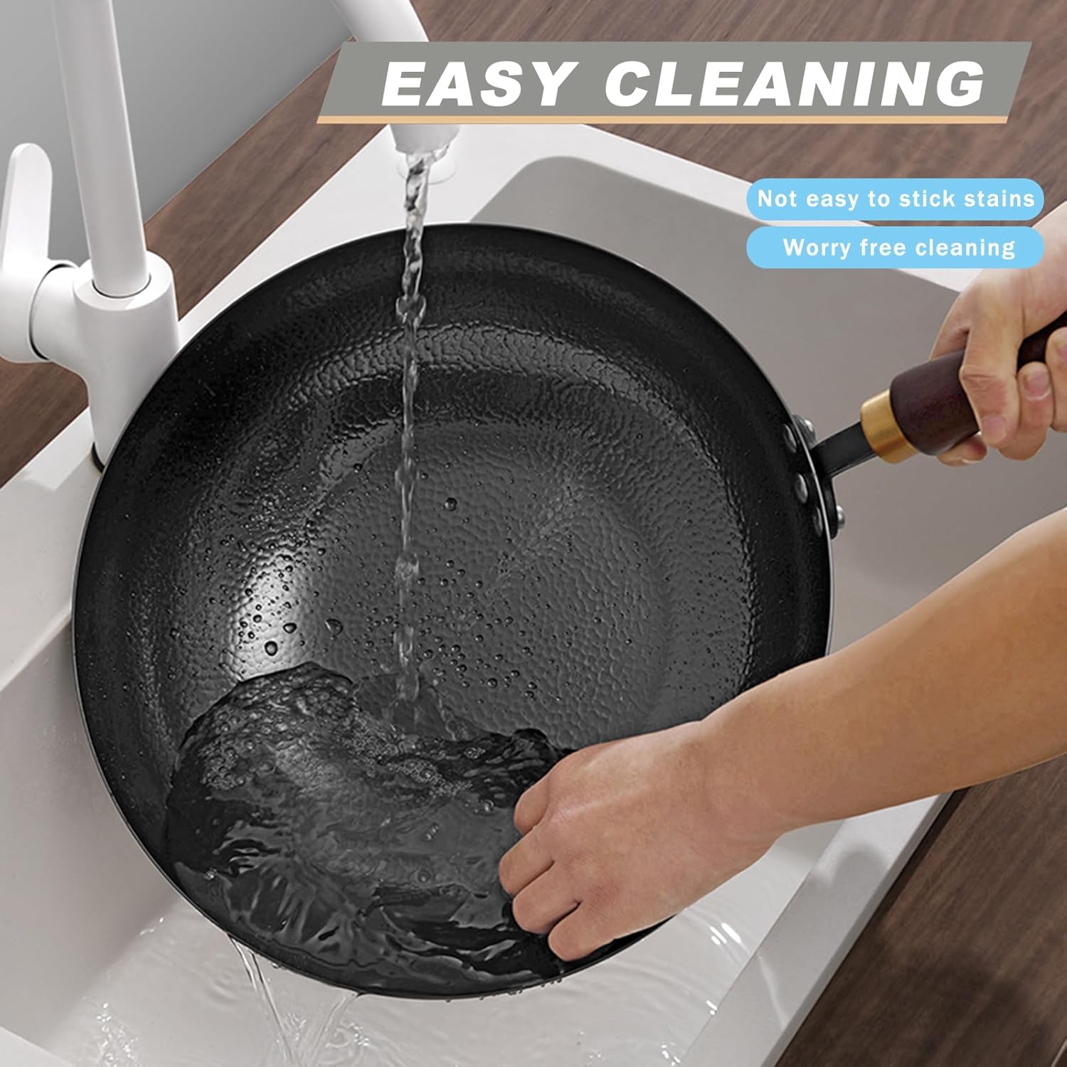 - CARBON STEEL WOK PAN: This wok pan is forged from carbon steel, renowned as the best material for woks. Once pre-seasoned, it develops a natural non-stick surface without any chemical coatings, nitriding process makes it less prone to rusting. It boasts exceptional durability, making it a reliable choice for your kitchen.