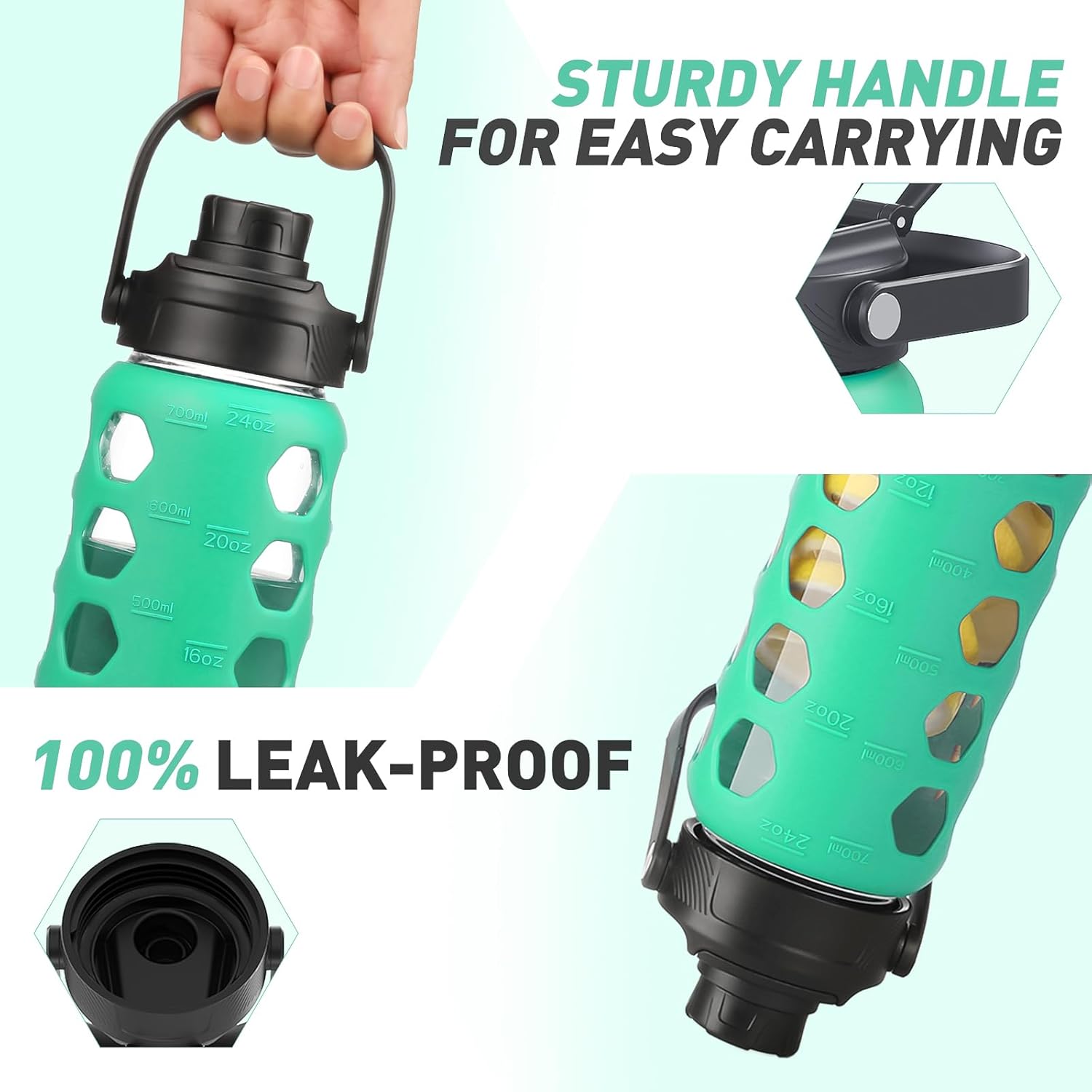 MUKOKO Glass Water Bottles, 24oz Glass Tumbler with Straw, Drinking Bottles with 2 Lids-Handle Spout Lid&Bamboo Straw Lid, Motivational Water Bottle with Time Marker and Silicone Sleeve, 1 Pack-Green