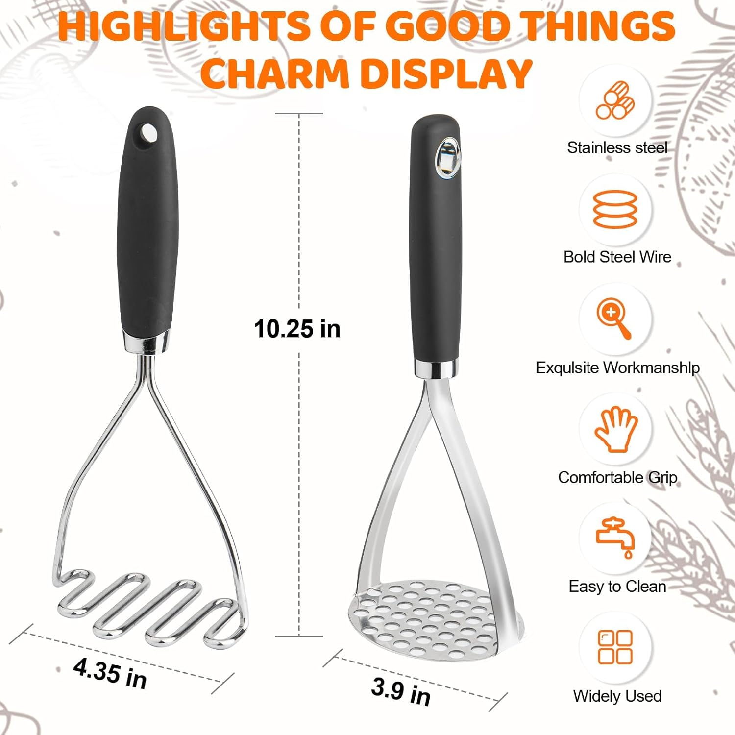 - ★ COMFORTABLE GRIP OF THE HANDLE: Potato masher Soft touch, anti slip, good balance, can achieve comfortable and stable operation, ergonomically designed, can be suspended, and saves space.