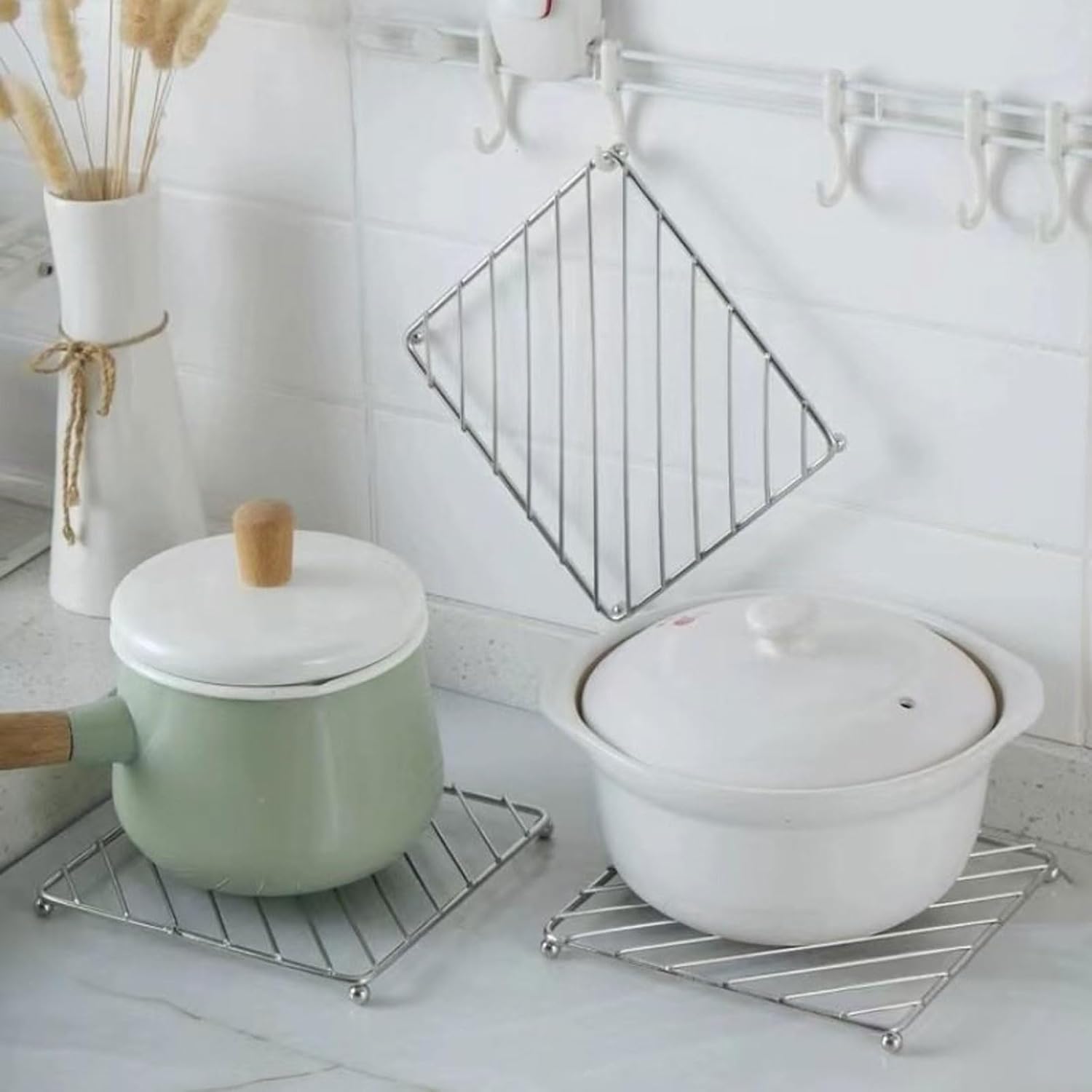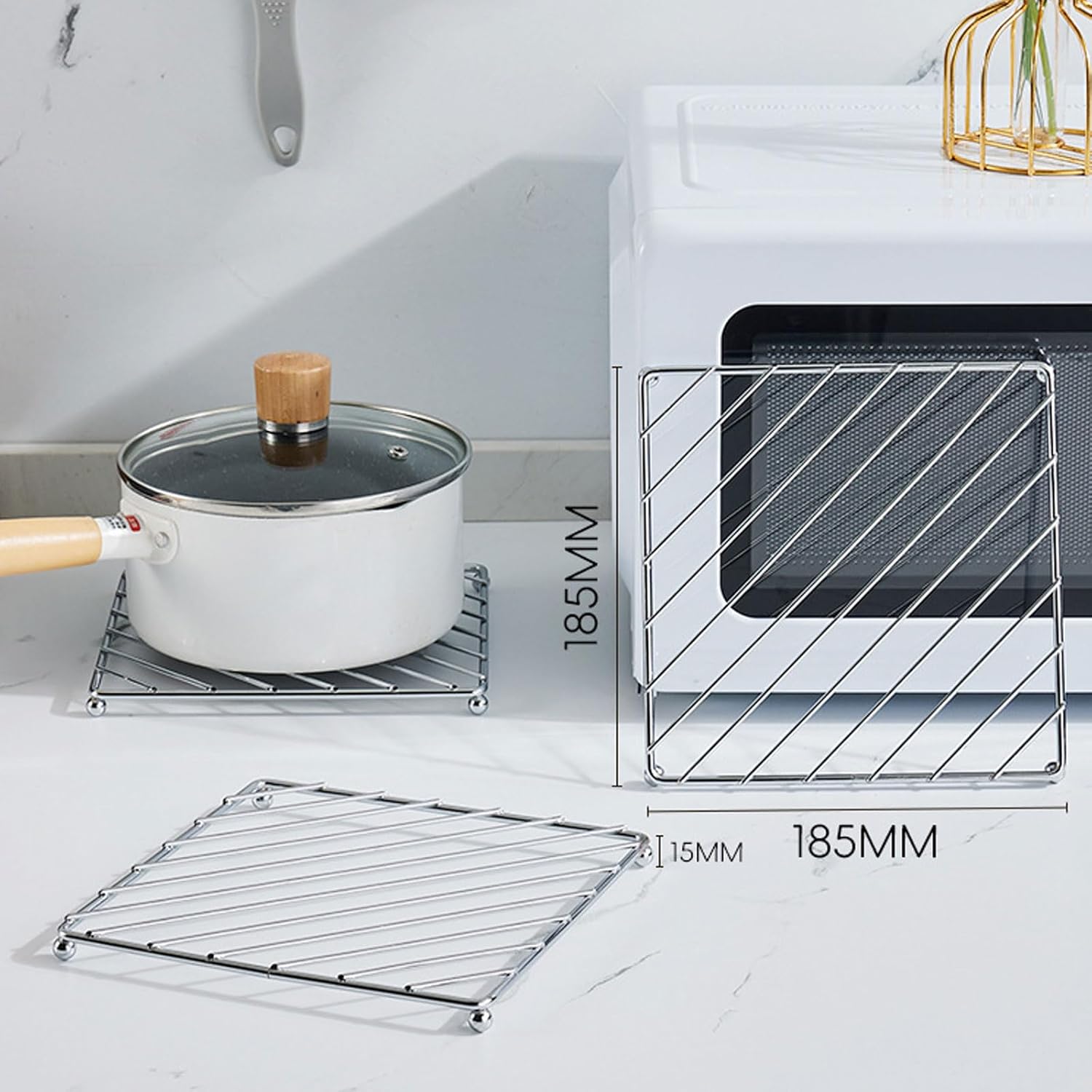 - EXQUISITE DESIGN OF STAINLESS STEEL POT STAND - These pot holders heat resistant have super elegant design bring the simple but luxurious kitchen decor to the dining table also to countertop of your kitchen.