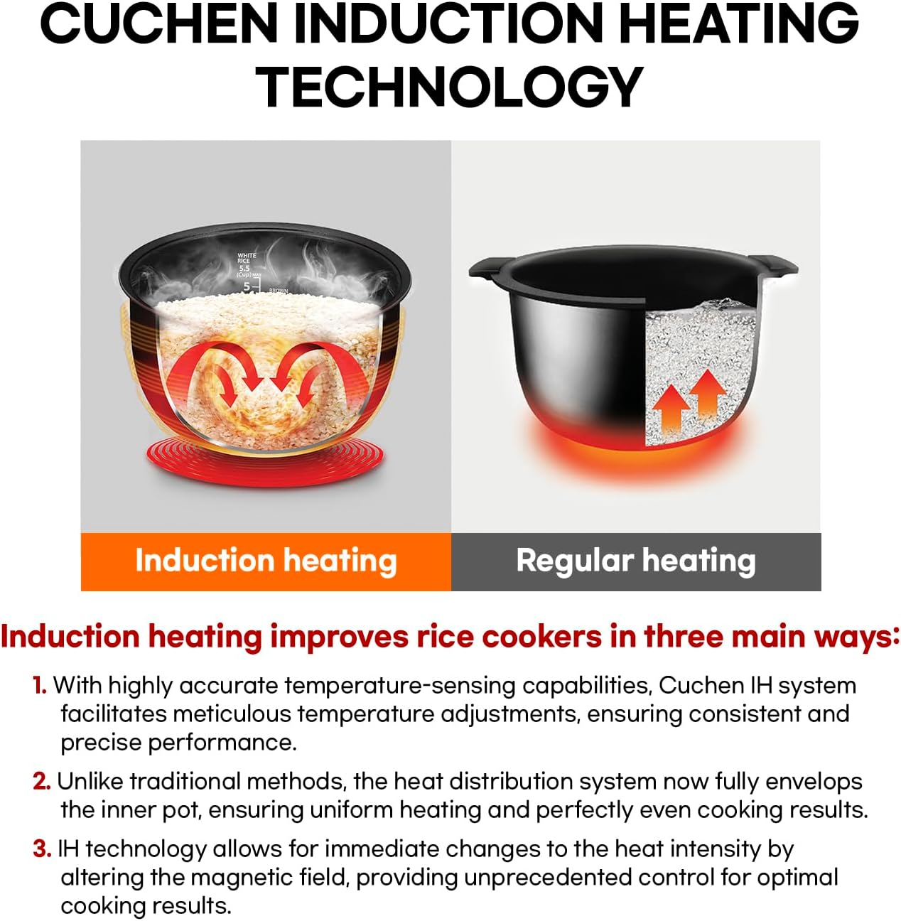 - INDUCTION HEATING: In contrast to conventional bottom-plate heating, induction technology envelops the inner pot entirely, resulting in a faster and more efficient cooking process, ultimately yielding more delectable outcomes