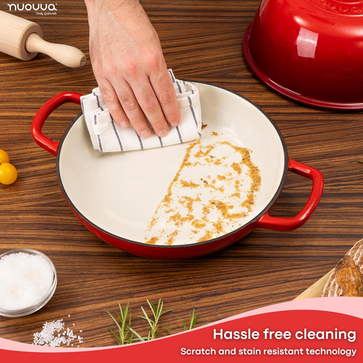 - ENAMELLED FINISH: The enamelled surface of the cast iron dutch oven pot by Nuovva is non-reactive, making it safe for all types of dough and ingredients. It resists rust and scratches, ensuring your pot remains in pristine condition for years. The smooth enamelled finish makes cleaning effortless!