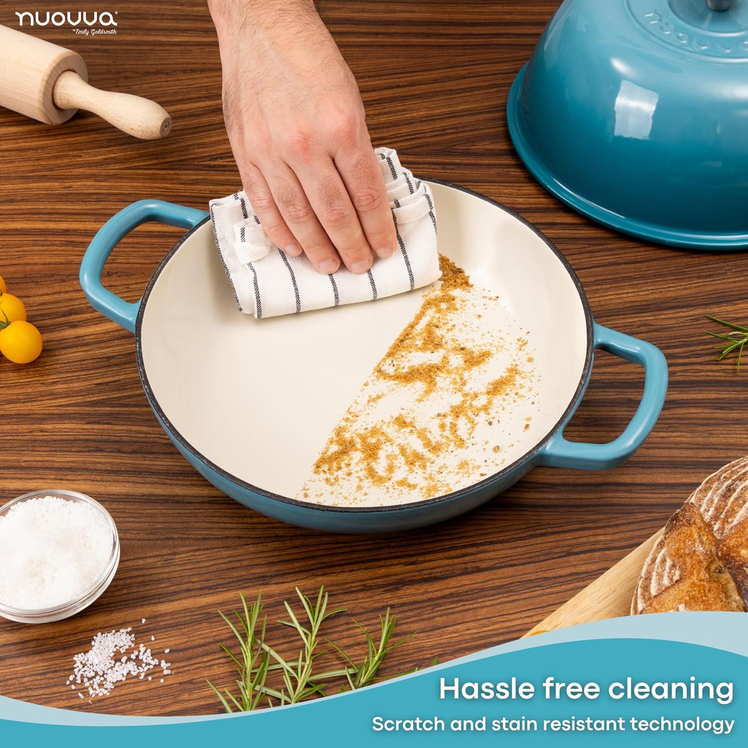 - ENAMELLED FINISH: The enamelled surface of the cast iron dutch oven pot by Nuovva is non-reactive, making it safe for all types of dough and ingredients. It resists rust and scratches, ensuring your pot remains in pristine condition for years. The smooth enamelled finish makes cleaning effortless!