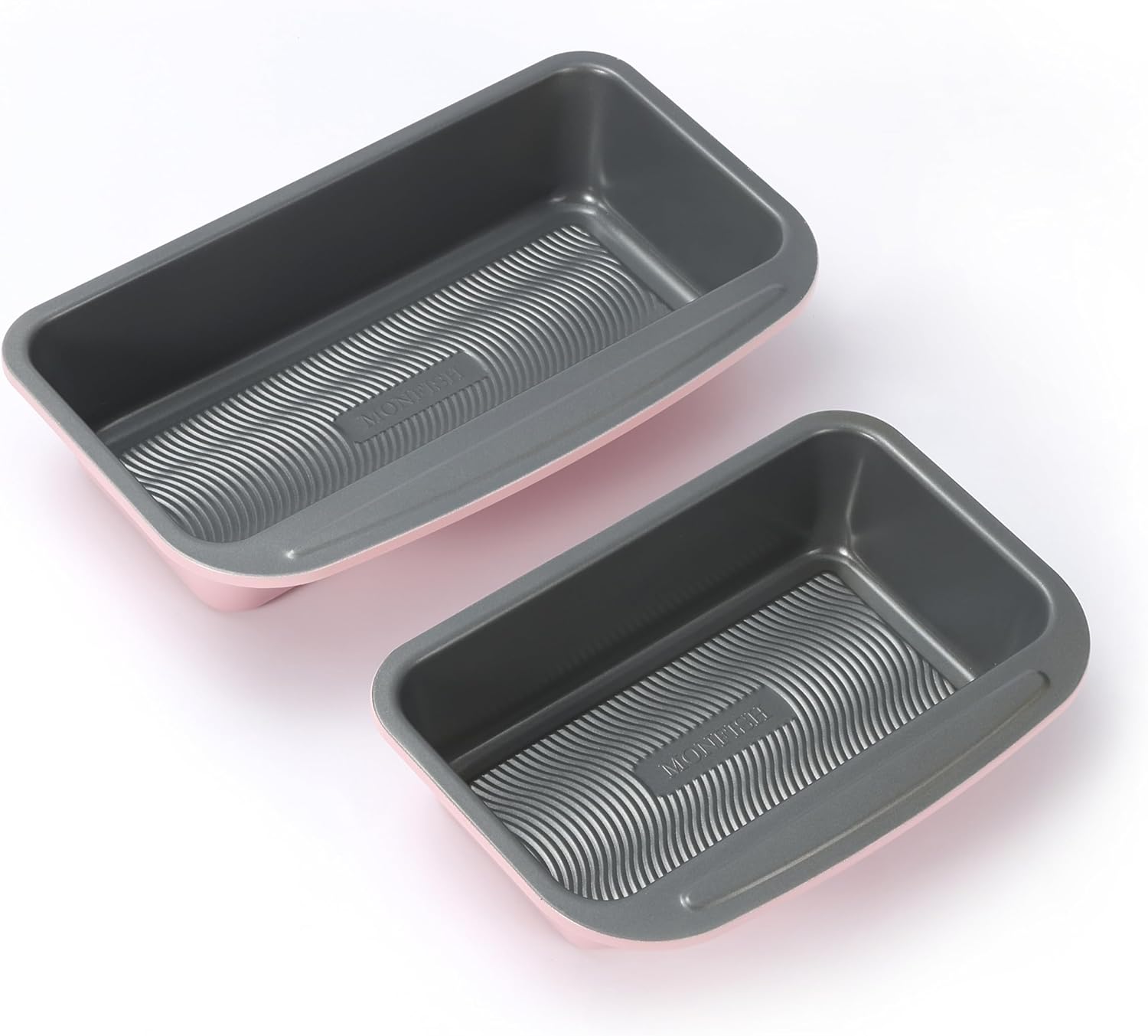 - WAVY BOTTOM PATTERN - There is a wavy pattern on the bottom of the pans to help with foods not sticking.This rectangle bread loaf pan is made with 0.6mm carbon steel that won't warp or rust over time. The weight is about 1.85lb/set. You will get 2pcs different size Pink loaf pan. Our rectangle loaf bread mold also has excellent heat conduction designed to cook your breads evenly.