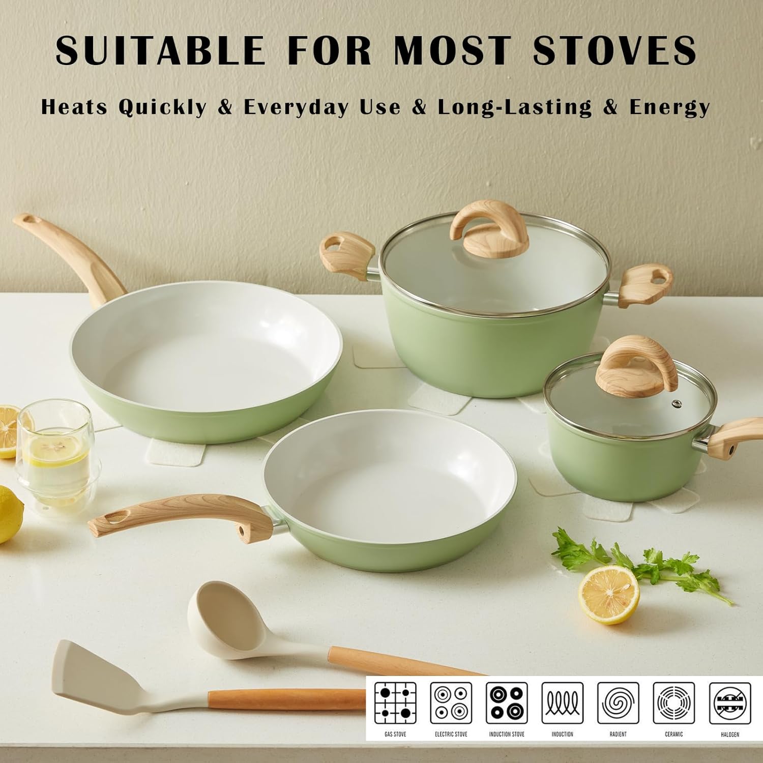 - Healthier & Safe Cooking: The set features a ceramic nonstick coating made without PFAS, PFOA, PFOS & PTFE that allows for effortless food release and an even easier clean up. High magnetic conductive stainless steel base allows our non stick kitchen cookware to work on all cooktops, like Electric, Halogen, Ceramic, Gas, Induction, Glass and Oven. The Extended and Thicken Bottom Design also makes the cookware durable and heats up quickly and evenly;