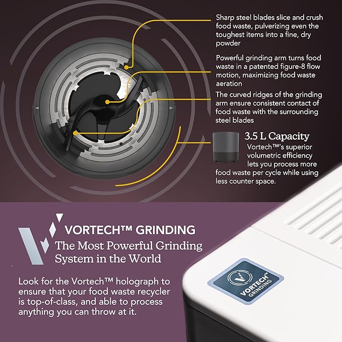 - INNOVATIVE VORTECH SYSTEM: The Eco 3’s Vortech(TM) patented grinding system can grind what others can't, so go ahead and toss in your pits, peels, bones, leftovers! Vortech's efficiency means the FoodCycler consumes less power than your average clothes dryer.