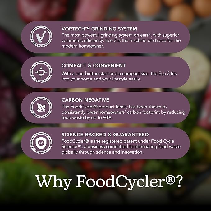 - TRANSFORM KITCHEN WASTE INTO PLANT FOOD -WITHOUT LIFTING A FINGER: The NEW FoodCycler Eco 3 is a convenient electric kitchen composter alternative to eliminate food waste. Ideal for the busy home, the Eco 3 quietly grinds your food waste into plant food, reducing the amount of trash you take out.