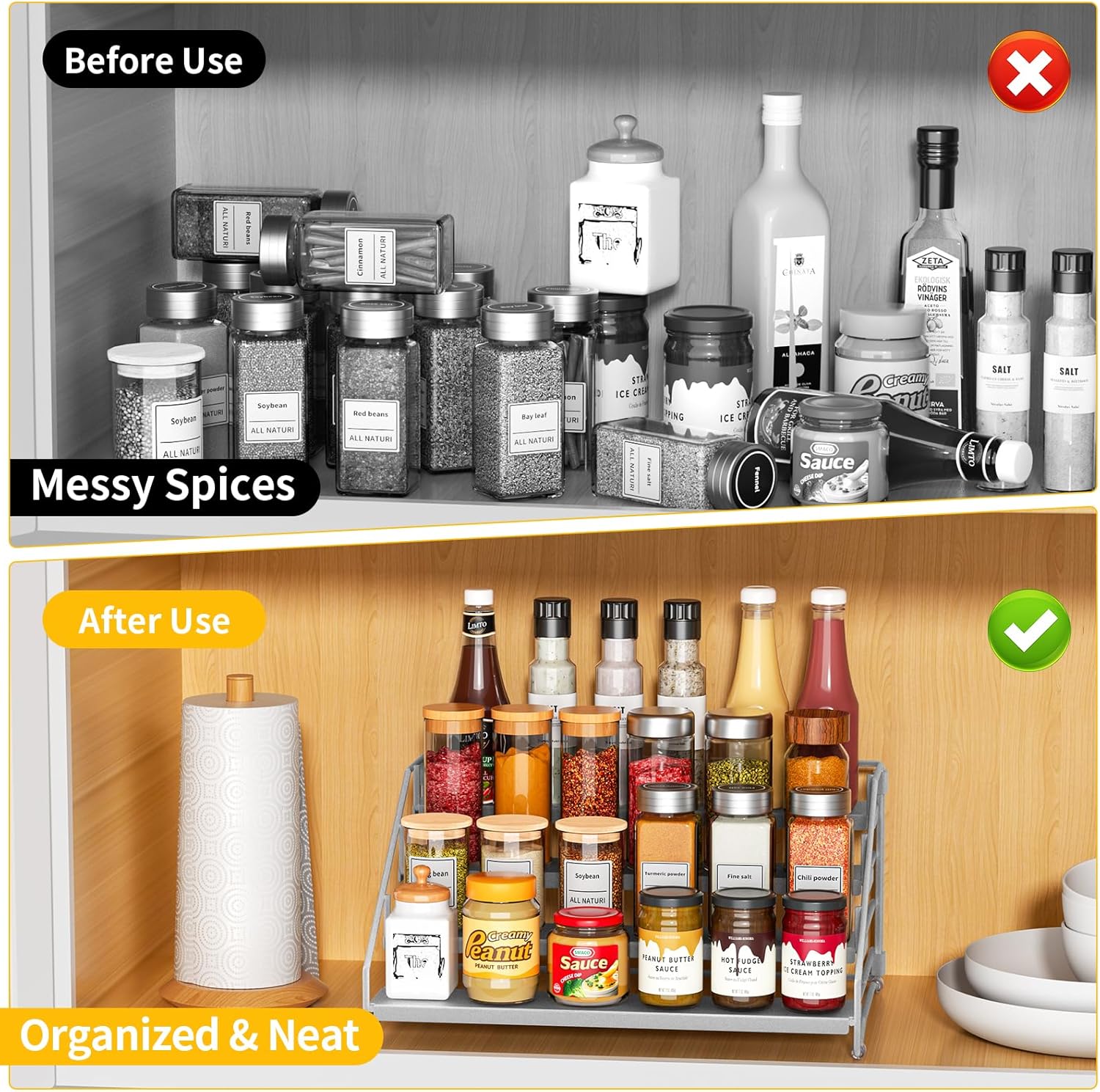 - 【Durable Metal,Strong And Sturdy】:The seasoning organizer rack made of high quality metal,sturdy frame and each tier has a sheet metal base design, provides spice bottles more stable to place and less to tip over. The surface of this cabinet organizer is smooth,with an anti-rust coating, and easy to clean with water or rag.