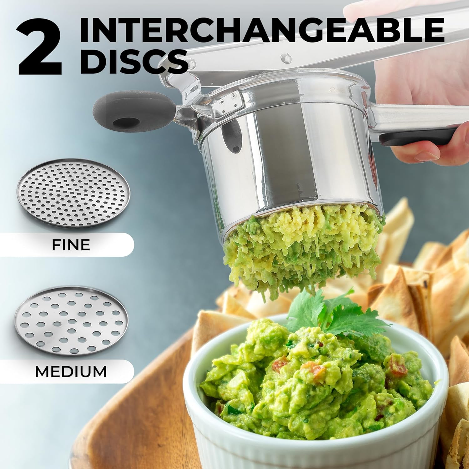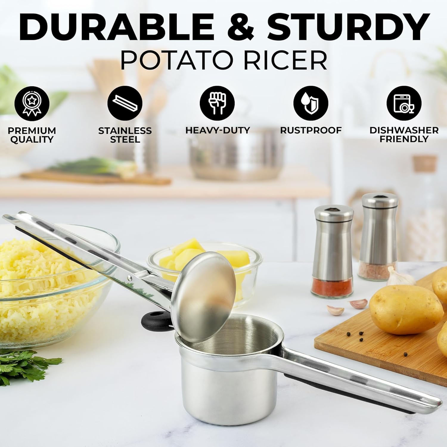 - SPUD-TACULAR KITCHEN TOOL: Making light and fluffy mashed potatoes has never been easier. With its strong and durable stainless steel material, this potato ricer is rust, corrosion, and stain resistant and durable enough to last you a lifetime.