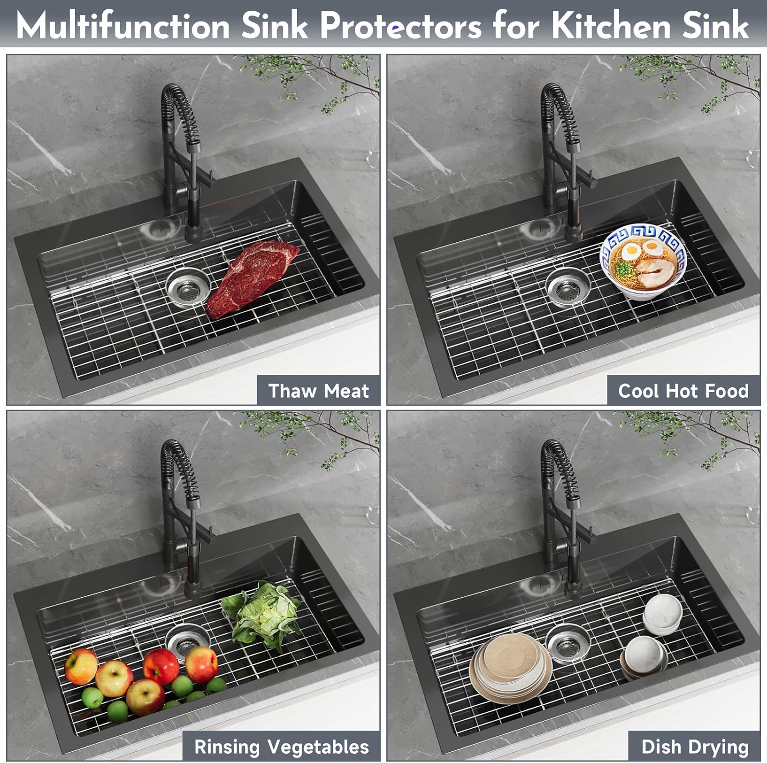 - Easy to Clean: Metal sink protectors for kitchen sink can be cleaned in the dishwasher or by hand. Simply rinse the rack with water and use it again. Great kitchen sink accessories! Note: The rubber mat must be removed before placing the grid in the dishwasher