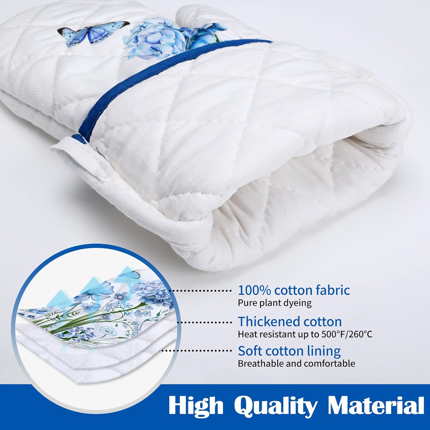 Blue Floral Oven Mitts and Pot Holders Sets 2Pcs, 100% Cotton Heat Resistant, Extra Long Oven Gloves Potholder for Kitchen Cooking Baking Decoration