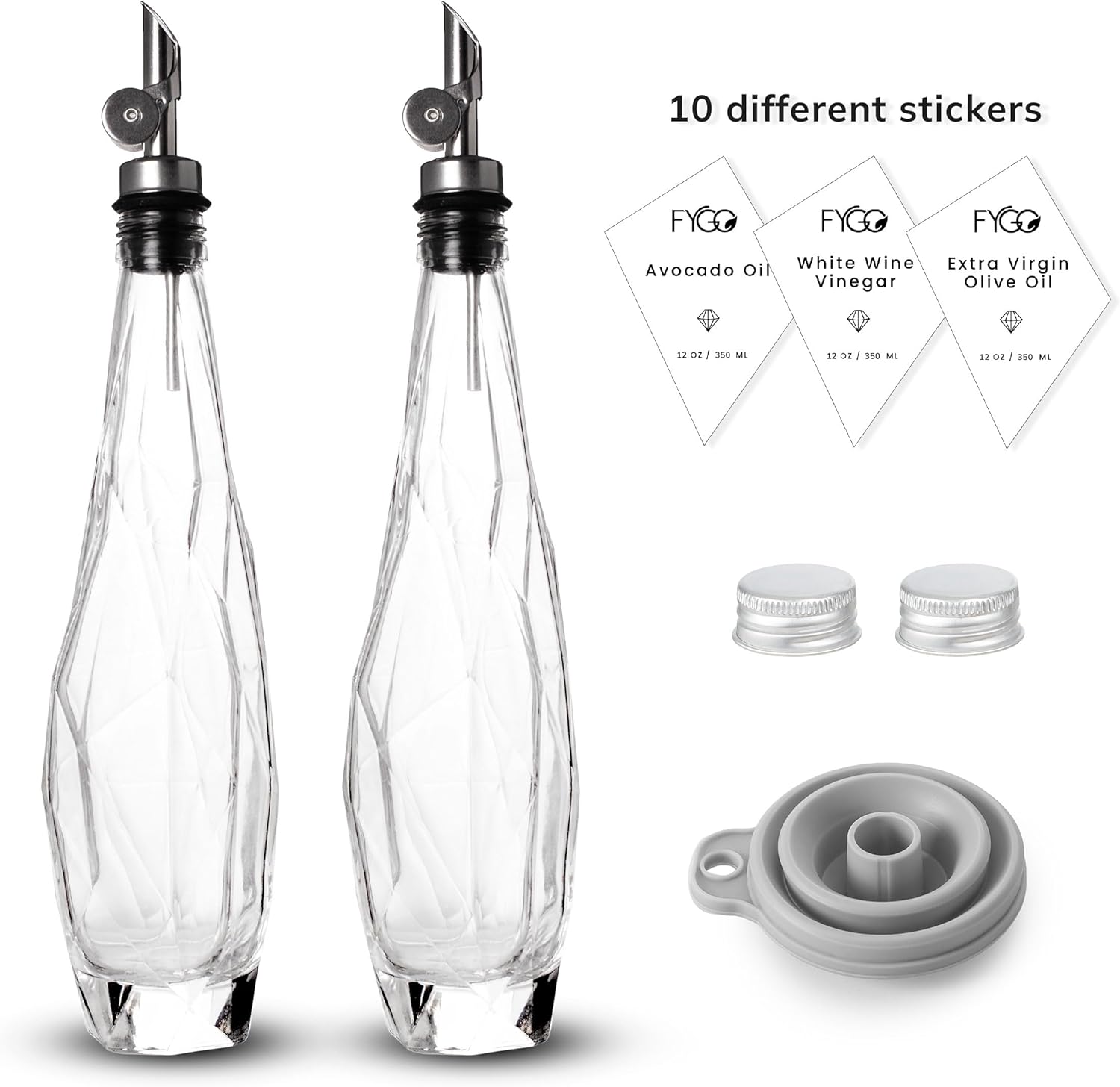 FYGO Diamond Lux Olive Oil Bottle Dispenser - Olive Oil Container- Oil and Vinegar Dispenser Set with Pourer and Funnel - Glass Dispenser Bottle for Kitchen - 500ml - Set of 2