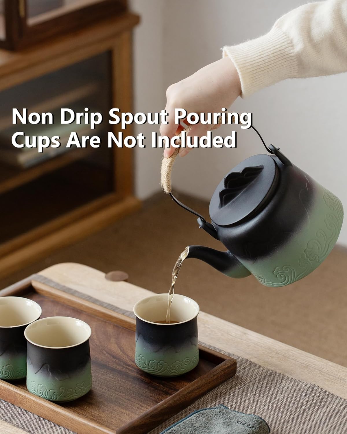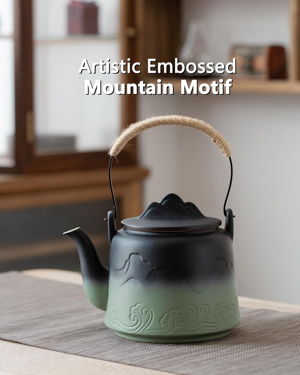 - HAND SPRAYED GLAZE JAPANESE TEAPOT: What a unique Asian teapots! The eye-catching gradient black and Matcha green glaze with artistic embossed mountain motif that resembles classic oriental landscape paintings. and lovely mountain on the lid, as well as a matte glaze hand-painted by artisans and a glossy beige interior, they are a blend of arts and aesthetics that add a vintage vibe to your tea and coffee table.