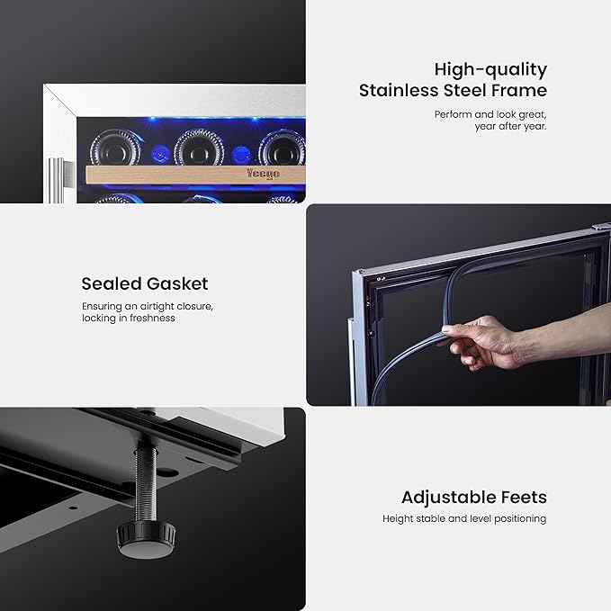 - 【LONG-LIFETIME DESIGN】Sleek silver finish with stainless steel door frame for long-time use, also suits any space, whether under counters or freestanding or built-in for your cabinet. Please note: the door is right-hinged by design, not reversible, and this model does not include a door lock. Our 24inch dual zone wine fridge perfect for kitchens, offices, dorms, etc. Our support team is available 24/7 to assist with installation and troubleshooting.