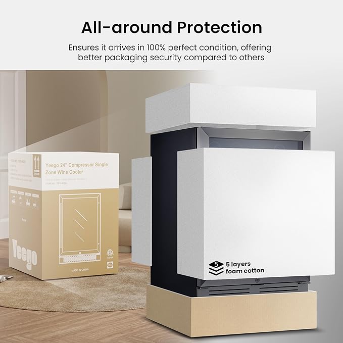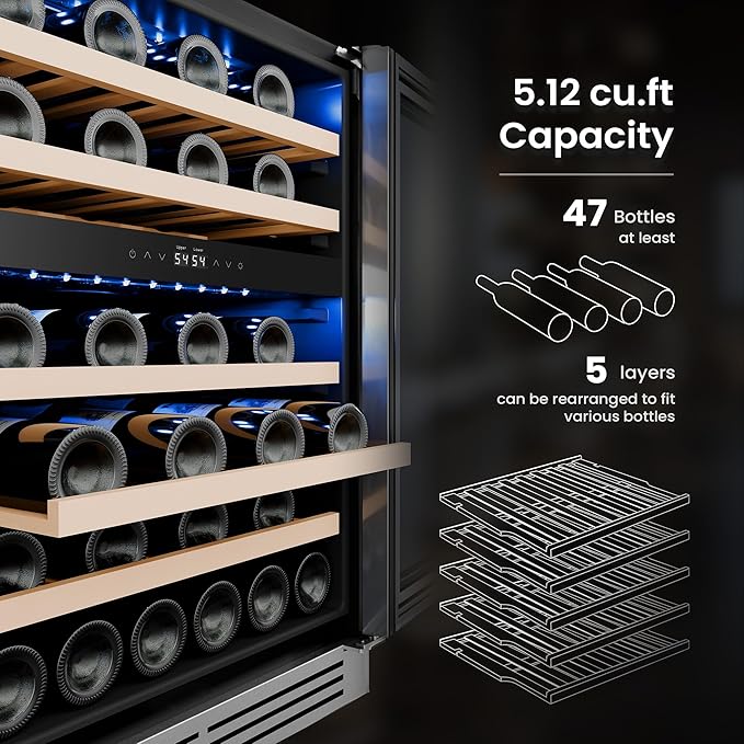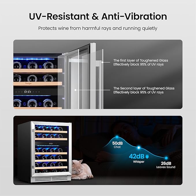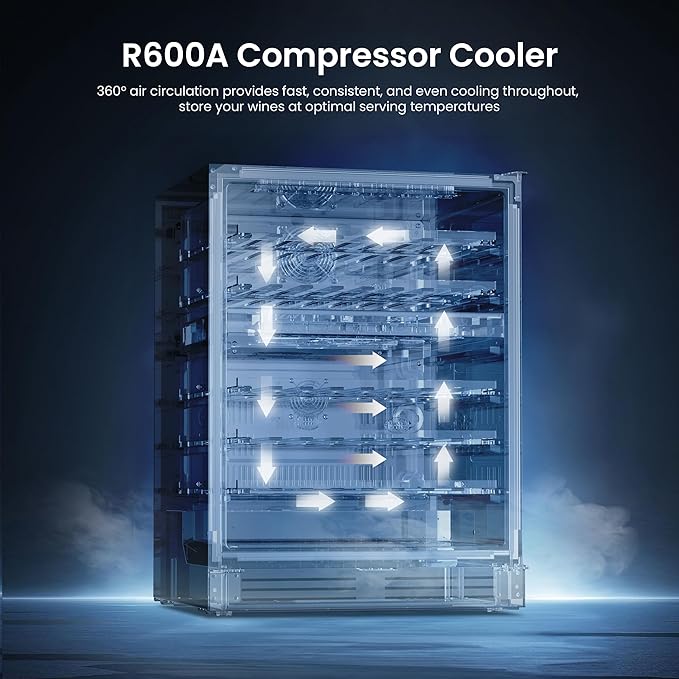 - 【ADVANCED COMPRESSOR & LOW NOISE & ANTI-VIBRATION】 This wine fridge ensures your wines are chilled evenly without disturbing sediments, and no vibration helps maintain your wine's rich flavor and taste. Enjoy silent, quick, and powerful cooling with our advanced cooling system. It is ideal for families and wine enthusiasts alike.