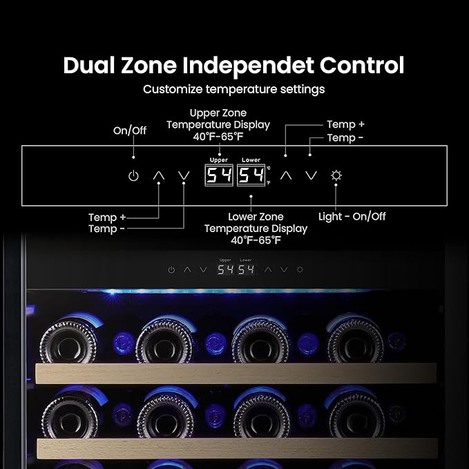 - 【WINE FRIDGE DUAL ZONE】 Our dual-zone wine cooler features 2 independent temperature control, with adjustable settings from 40℉~65℉, you can keep your red, and white wines or champaigns at their optimal temperatures, enhancing both the flavor and longevity of your collection.