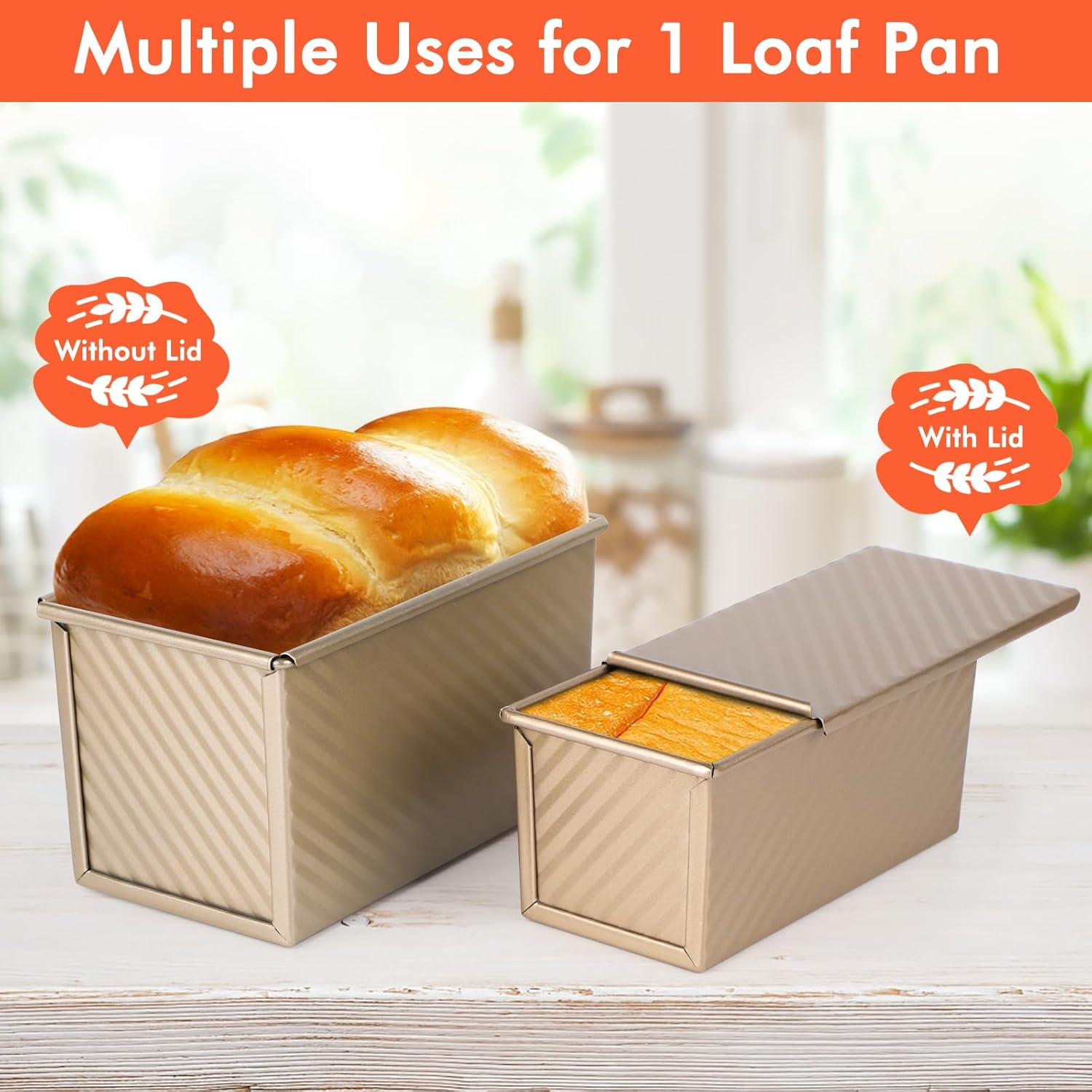 - Different Uses for 1 Loaf Pan --- Whether you want to make square bread or toast bread, Beasea loaf pan with cover can handle it easily. Flexible use of the lid according to your needs. The kind design can help get two uses of 1 pullman bread pan, which makes beautiful regular loaf bread and slices of sandwich bread. One big one small pans can meet different daily needs, and the set of 3 different scrapers can help a lot during making breads.