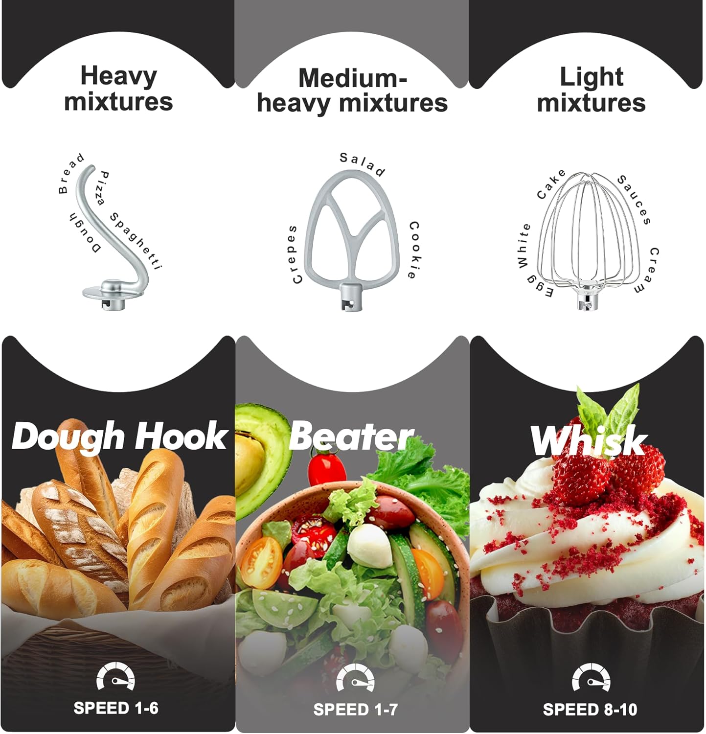 - 10 Speeds and Tilt Head Design - This Kitchen mixer has 10 different speed options,suitable for mixing bread dough, thick batters, meringues, and whipping cake cream, plus lower speeds for stirring and finessing your most delicate concoctions,could suit perfectly to different ingredients. Tilt-head design mixer allows access to install or uninstall bowls and accessories easily.