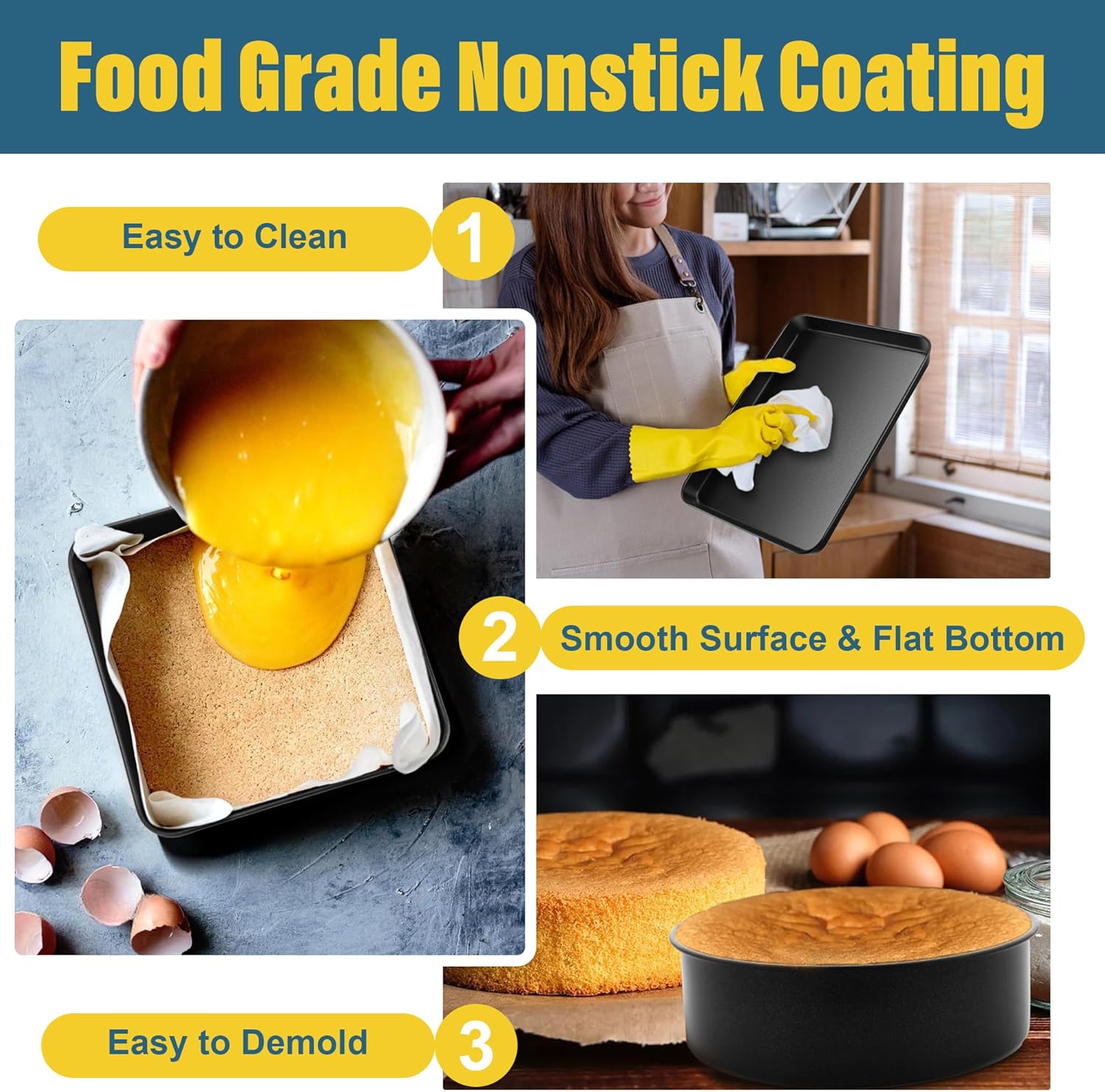 - HEALTHY AND EASY CLEANING COATING: Coated with food grade nonstick coating, No-toxic and no worry of harmful substances released into your food, They are so easy to use that you can throw parchment paper away, Even you spray little oil still can demold cake in a complete shape easily, Less cake/food stick on the sheet pan, which makes low-fat and healthy food, And you can spend less time in cleaning and make cleaning a breeze, Healthy and effortless for every meals
