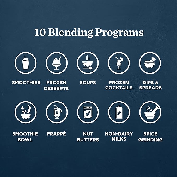 - Blending Programs: 10 blending programs ensure convenience and consistent results. (Smoothies, Frozen Desserts, Soups, Frozen Cocktails, Dips & Spreads, Smoothie Bowl, Frappé, Nut Butters, Non-Dairy Milks, and Spice Grinding)