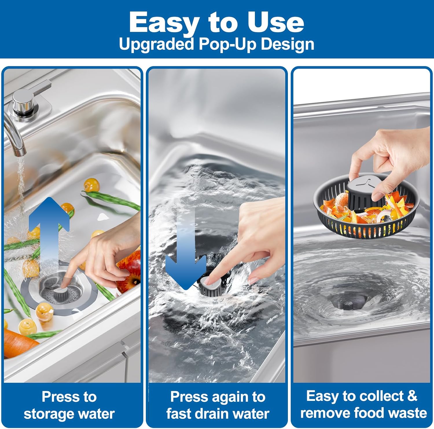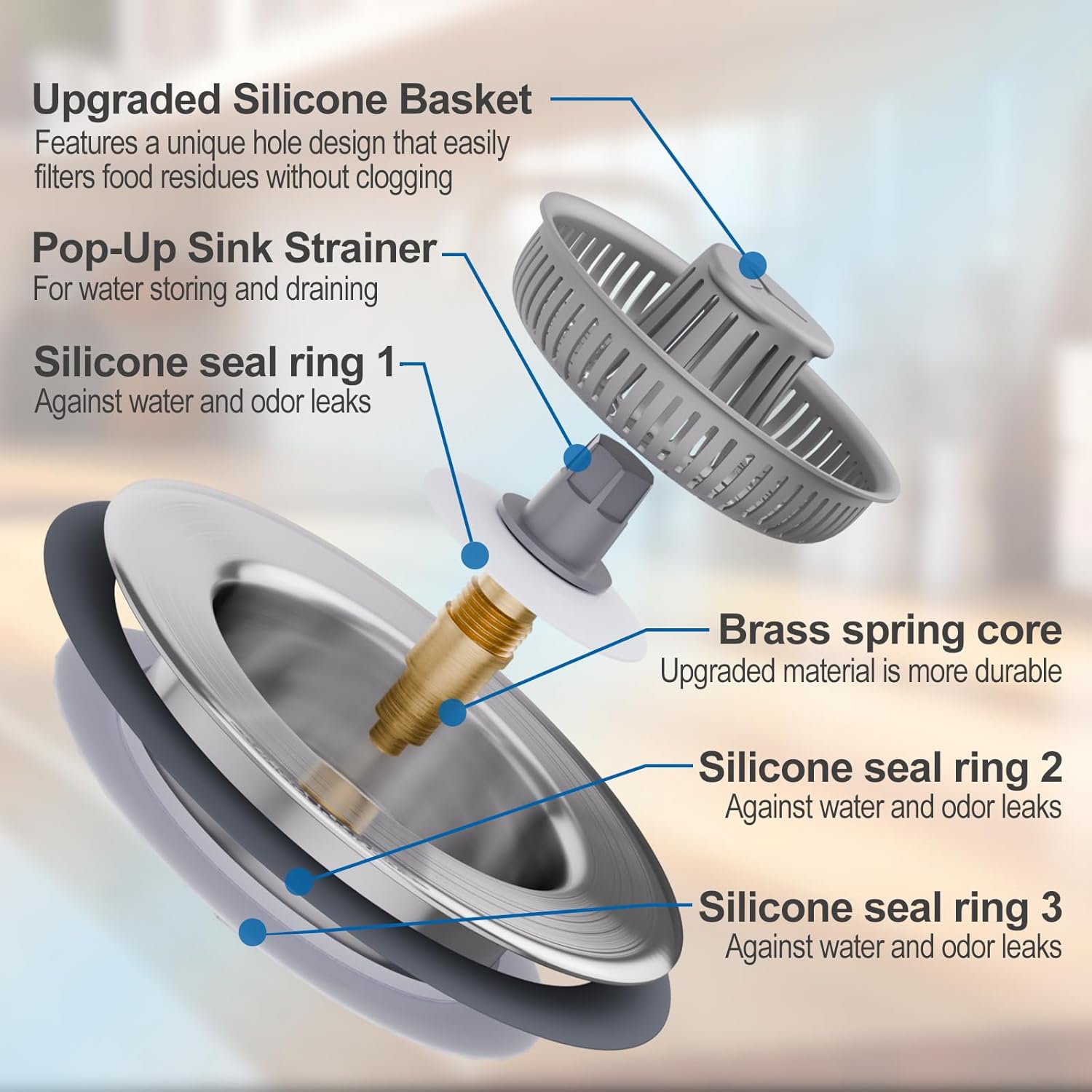 - 【Smart Pop-Up Mechanism & Leak-Proof Triple Seal】 Press the one-touch spring stopper for instant drainage or water storage. The 3-layer silicone rings create a tight seal against leaks and foul smells, ensuring a hygienic kitchen.