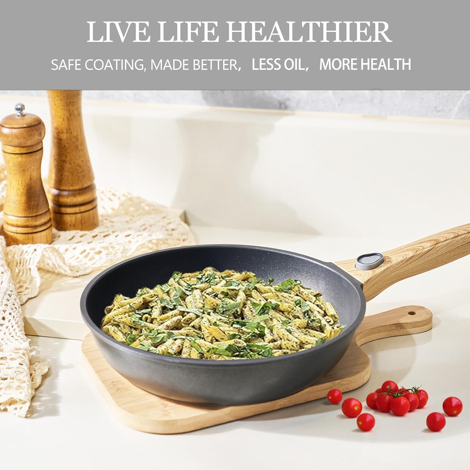 - NON STICK FRYING PAN: Master crispy, golden perfection with our 9.5" nonstick skillet! The granite coating resists scratches and peeling, ensuring zero sticking for eggs, stir-fries, or delicate fish. Plus, it uses 60% less oil for healthier meals!