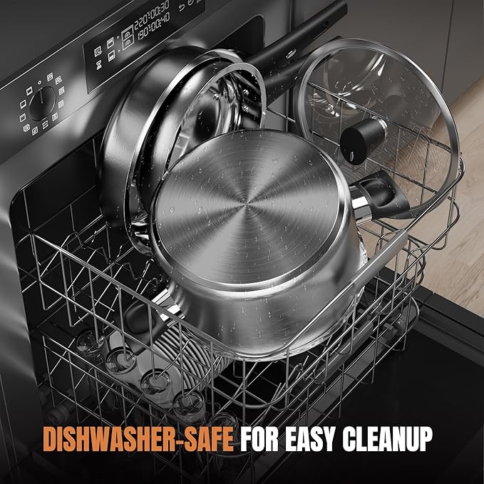 - 【Non-Toxic Induction Cookware Set】This pots and pans set is made of food-grade stainless steel, which is rust and corrosion resistant. Stainless steel without any coatings, so 100% free of Teflon, PFOA, PFOS, PTFE, Lead and Cadmium. Ensures that your daily cooking is always safer and healthier