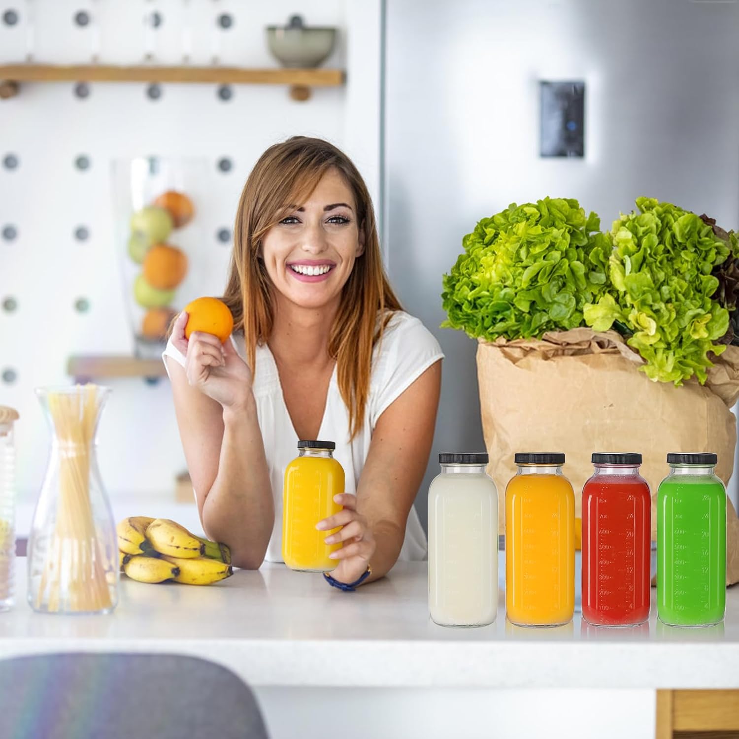 - Complete Set: 4 pack 32 oz square glass bottles with reusable BPA-free plastic lids; includes 1 soft sponge brush for scratch-free cleaning; 6 color-coded labels for quick content; secured with shock-absorbing foam packaging for safe delivery
