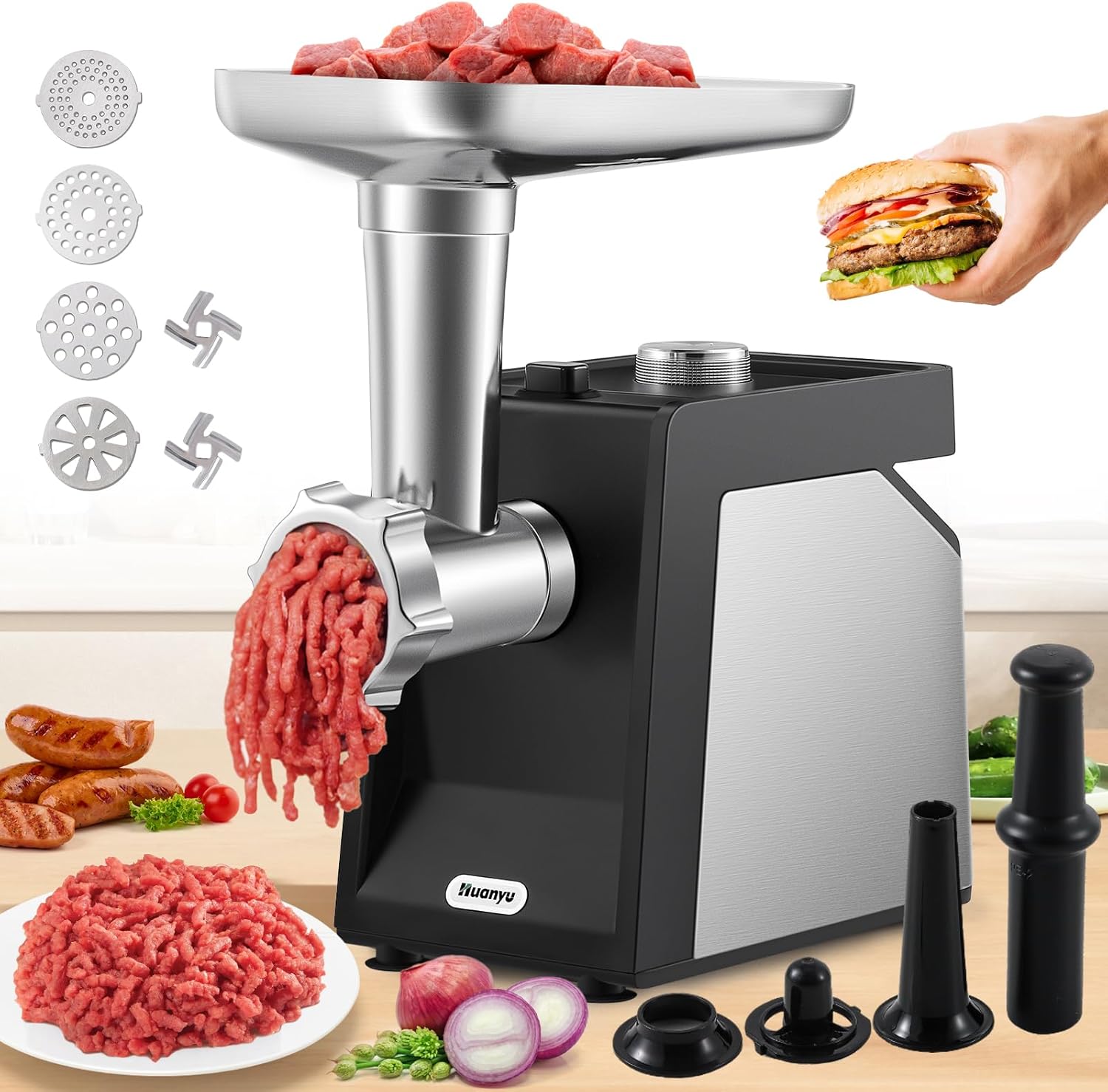 Huanyu Electric Meat Grinder for Home Use, Quiet for Apartment Cooking, Process Beef & Venison in 90s, Sausage Kubbe Prep Kit 110v