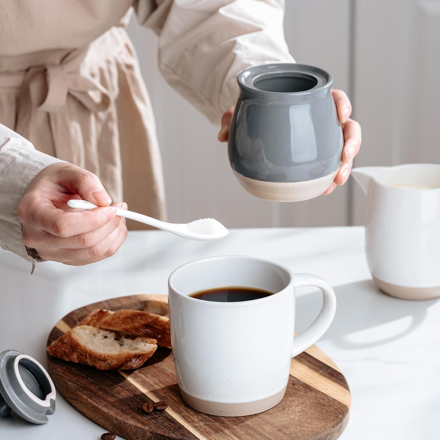 - Sugar Bowl with Lid and Spoon: This 10-ounce sugar bowl (2.7" diameter x 4.7" height) is perfect for daily use. Ideal for storing granulated sugar, sugar cubes, sweeteners, salt, spices, or even coffee beans.