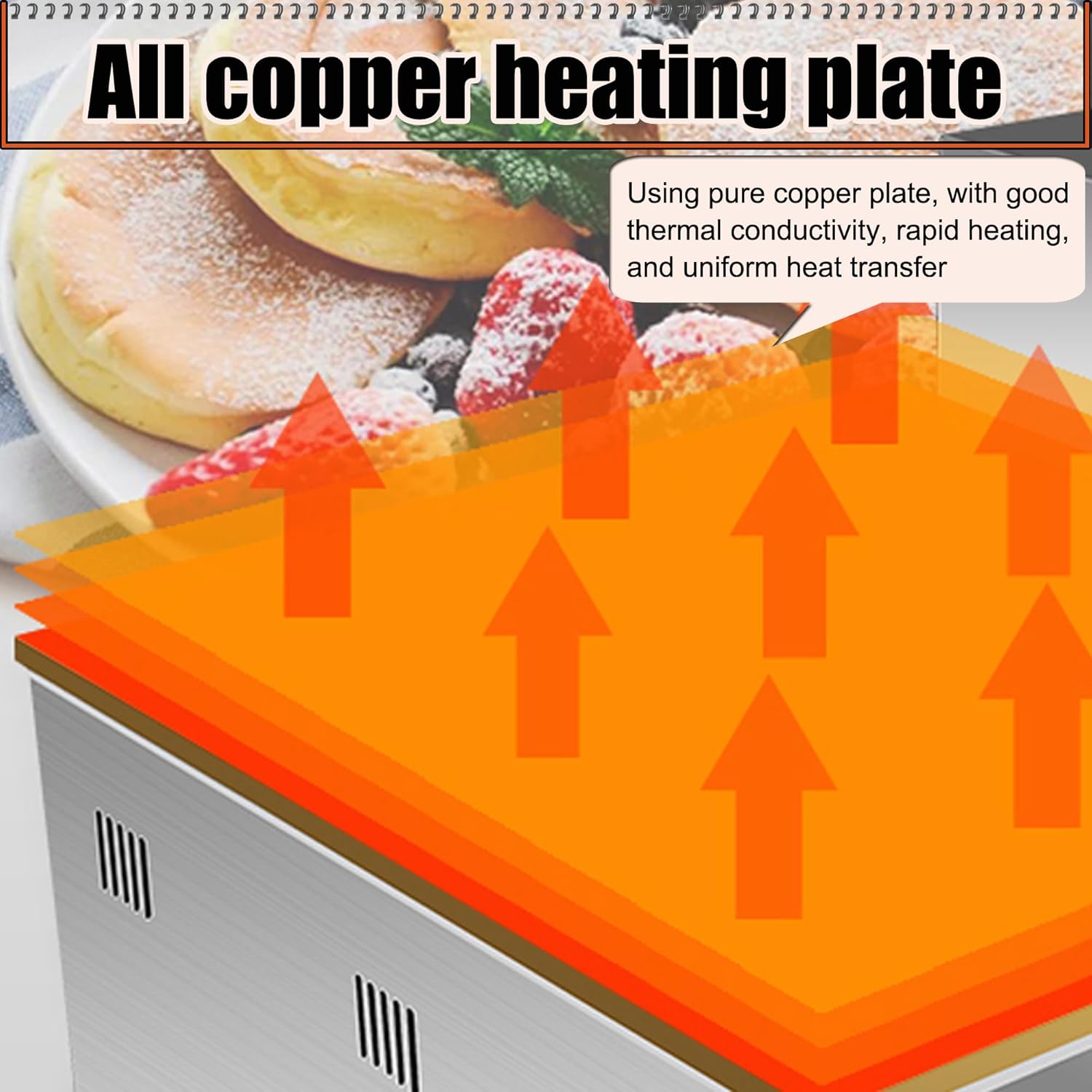 - [Fast Heating]The pancake maker has the characteristics of fast heating and uniform heat. The entire panel is made of pure copper and has good thermal conductivity. Rapid heating, reduced energy consumption, and uniform heat generation