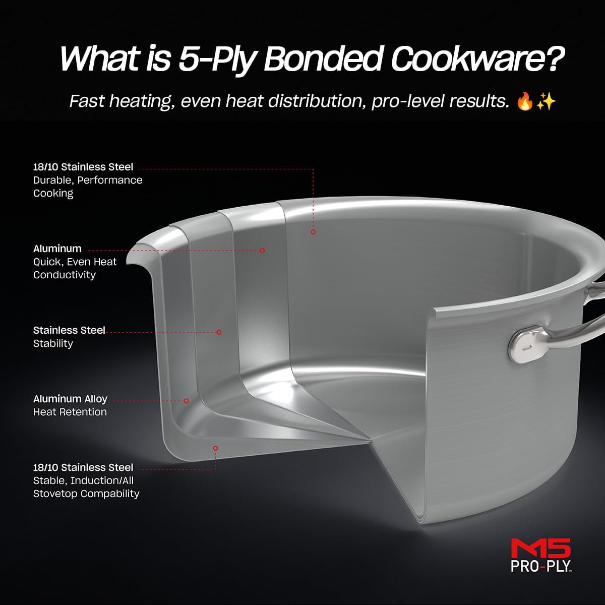 - 5-LAYER BONDED CONSTRUCTION: Delivers fast, even heating with no hot spots—so your food cooks more evenly every time. Made with premium 18/10 stainless steel and a 3-layer aluminum core for long-lasting performance. The 3mm thick body retains heat better and resists warping, even under high heat.