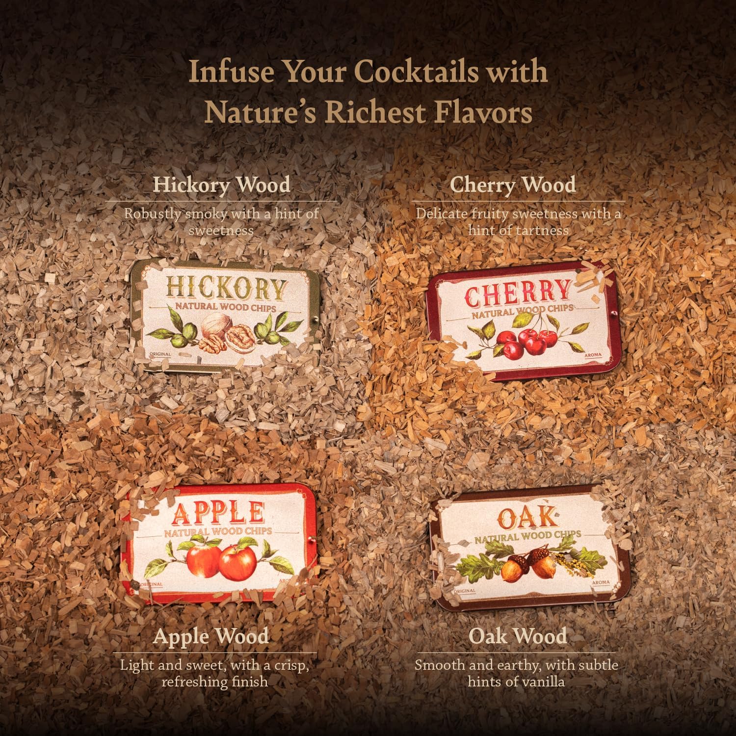 - Natural Wood Chips with Four Distinct Flavors: Made from natural materials with no additives, pairing expertly with whiskey, bourbon, or any craft cocktail. Hand-selected to create a range of deep, smoky profiles, these wood chips bring out the unique character of your drinks with a simple, refined touch.
