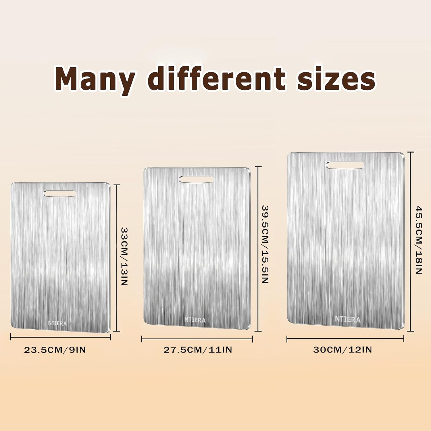 - 【Size Diversity】Our stainless steel cutting Board collection includes three versatile sizes to match your cooking needs:9*13in,11*15.5in and 12*18in.Please select the large or small cutting board that best suits your needs according to various use scenarios. Rest assured, our range of cutting board sizes is ample to meet your requirements.