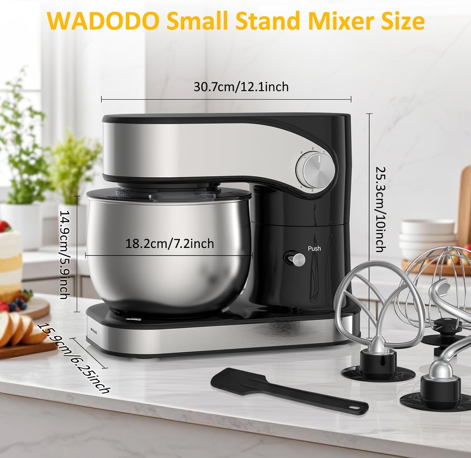 - 【More Healthier & Safer】WADODO Small Stand Mixer (12.1"D x 6.25"W x 10"H) made with 304 food-grade stainless steel bowls and part of the body, heat-resistant, easy to clean, safe for direct food contact, and more sturdy and durable. Our mixer is designed to be compact, which helps save space.