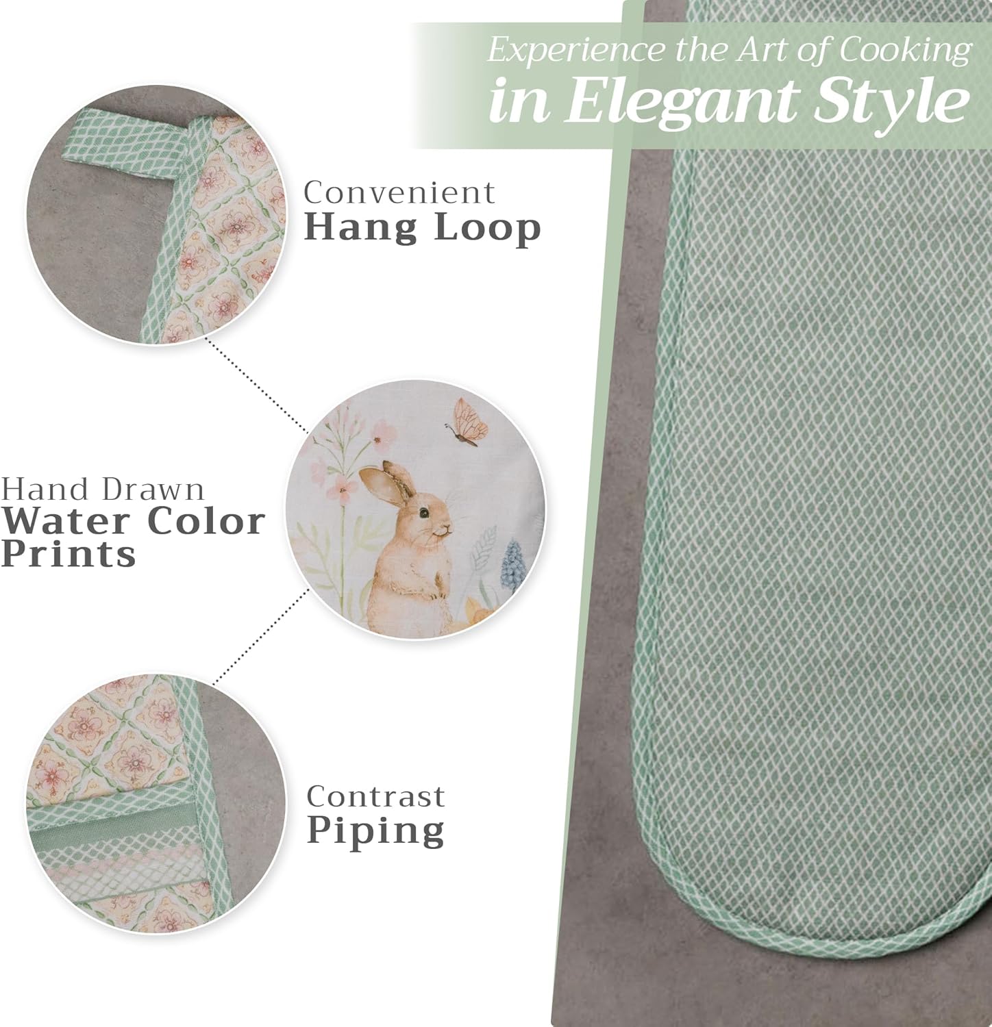 Maison d' Hermine Double Oven Mitts 100% Cotton 7"x35" Double Oven Mitt Heat Resistant BBQ Cooking Gloves with Loop, Baking, Grilling, Home, Kitchen, Handling Hot Pans Spring Summer (Easter Dew)