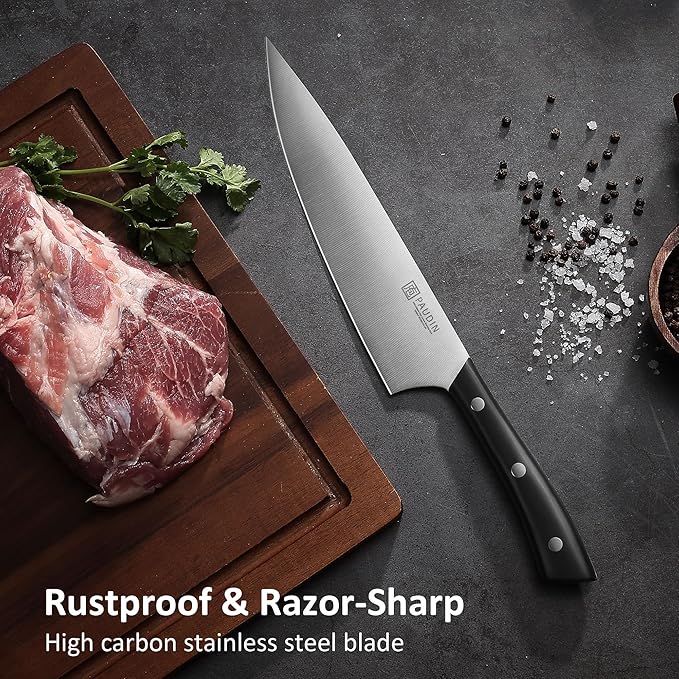 - GERMAN STAINLESS STEEL: Made from high-carbon 1.4116 German stainless steel, these rust-resistant blades handle all kitchen tasks with precision. Satin-finished for durability and effortless cutting.