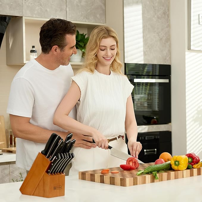 - Superior Craftsmanship: A hand-polished edge at a 15-degree angle per side achieves its ultimate sharpness, ensuring dependable performance. The block knife set features professional-grade matte finish blades with precise cutting capabilities that have been finely honed to ensure lasting sharpness.