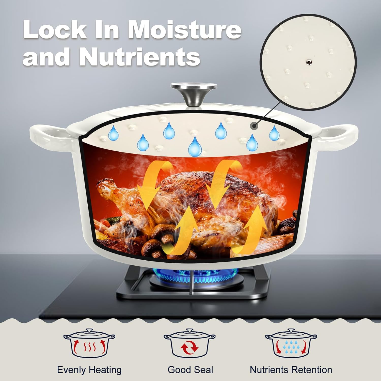 - 【Lock In Moisture & Nutrients】Cast iron core will distribute heat evenly and maintain stable heat after preheat, Can cook the food sufficiently and keep nutrients well, Also can preserve heat after finishing cooking, Good seal and self- bathing design make the water vapor condensed on the lid and fell down to keep the food at a proper humidity and retain the original juice of the ingredients, Ensure the good taste and nutrients of the food