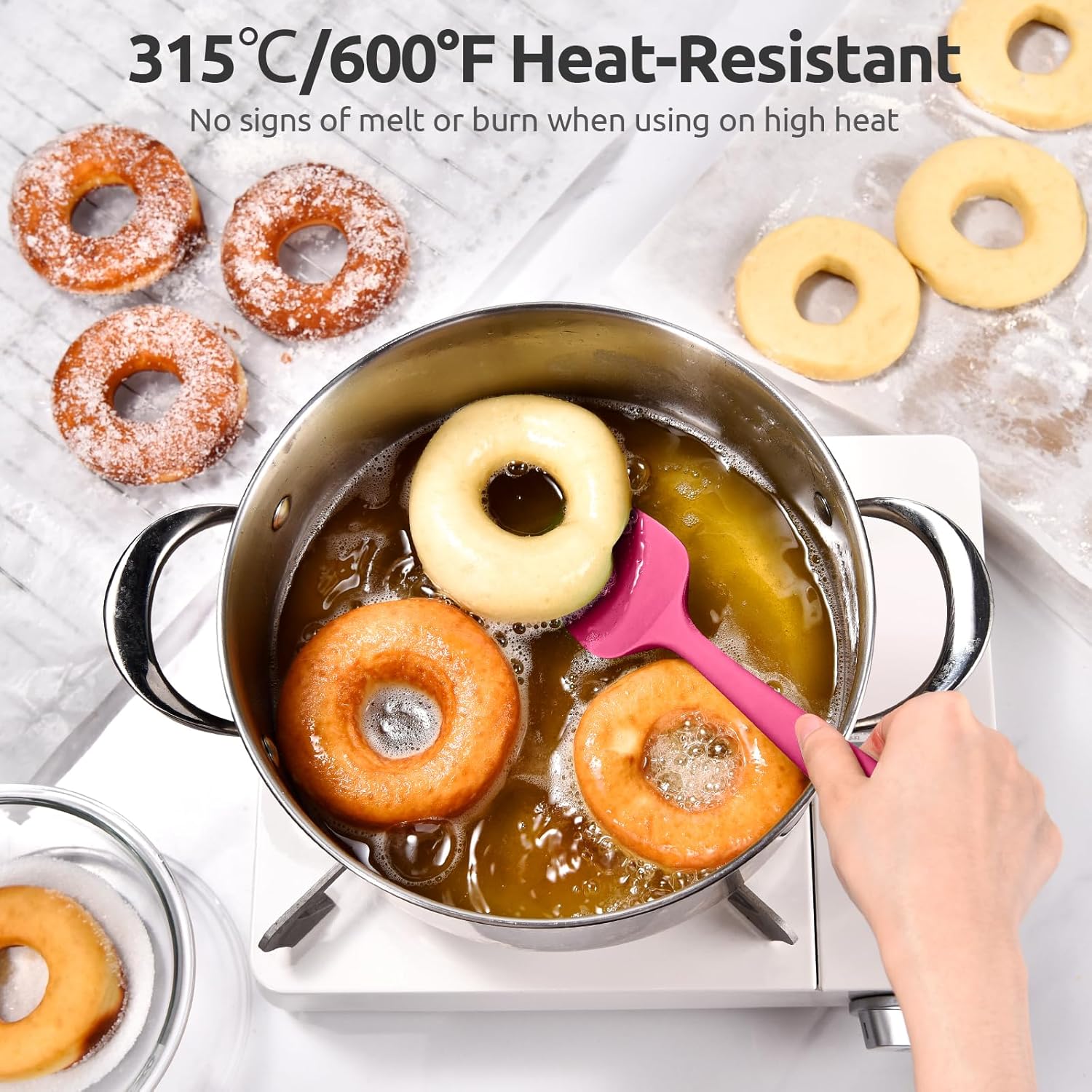 - [600ºF Heat-Resistant for High Heat Cooking] With up to 600 degrees heat resistance, you can use this nonstick silicone spatula in a hot pan without worrying about melted plastic in your dinner. It also works well with high temp sugars, chocolates or sauces. A must for newer cooks who might tend to leave utensils in a nonstick pot while cooking. You can use this heat safe silicone scraper daily for everything from stirring to frying to smoothing.