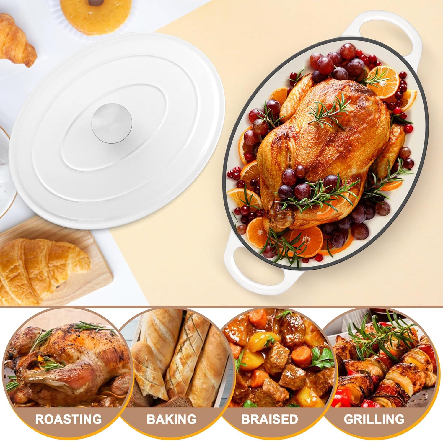 - PERFECT SIZE & MULTI PURPOSE: Oval shape with 7qt ample size perfect for a full sized chicken or oblong sourdough loaf, Go nicely from oven for baking artisan bread/casserole to stove top for soup/stews, Or directly to table for serving with its rustic white look, Versatile for broiling, braising, frying, sauteing