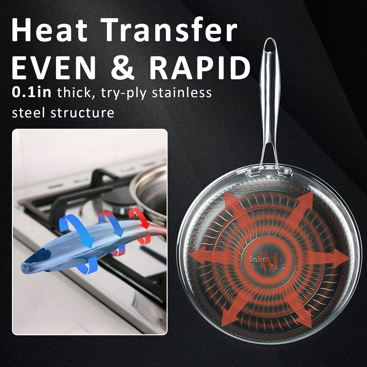 - Compatible with All Stovetops - Featuring a perfectly magnetized base, this stainless steel pan conducts heat quickly and evenly, making it suitable for gas, ceramic, electric, oven, and induction stovetops. It's an ideal upgrade or replacement for any kitchen, seamlessly fitting various cooktops and enhancing your cooking experience.